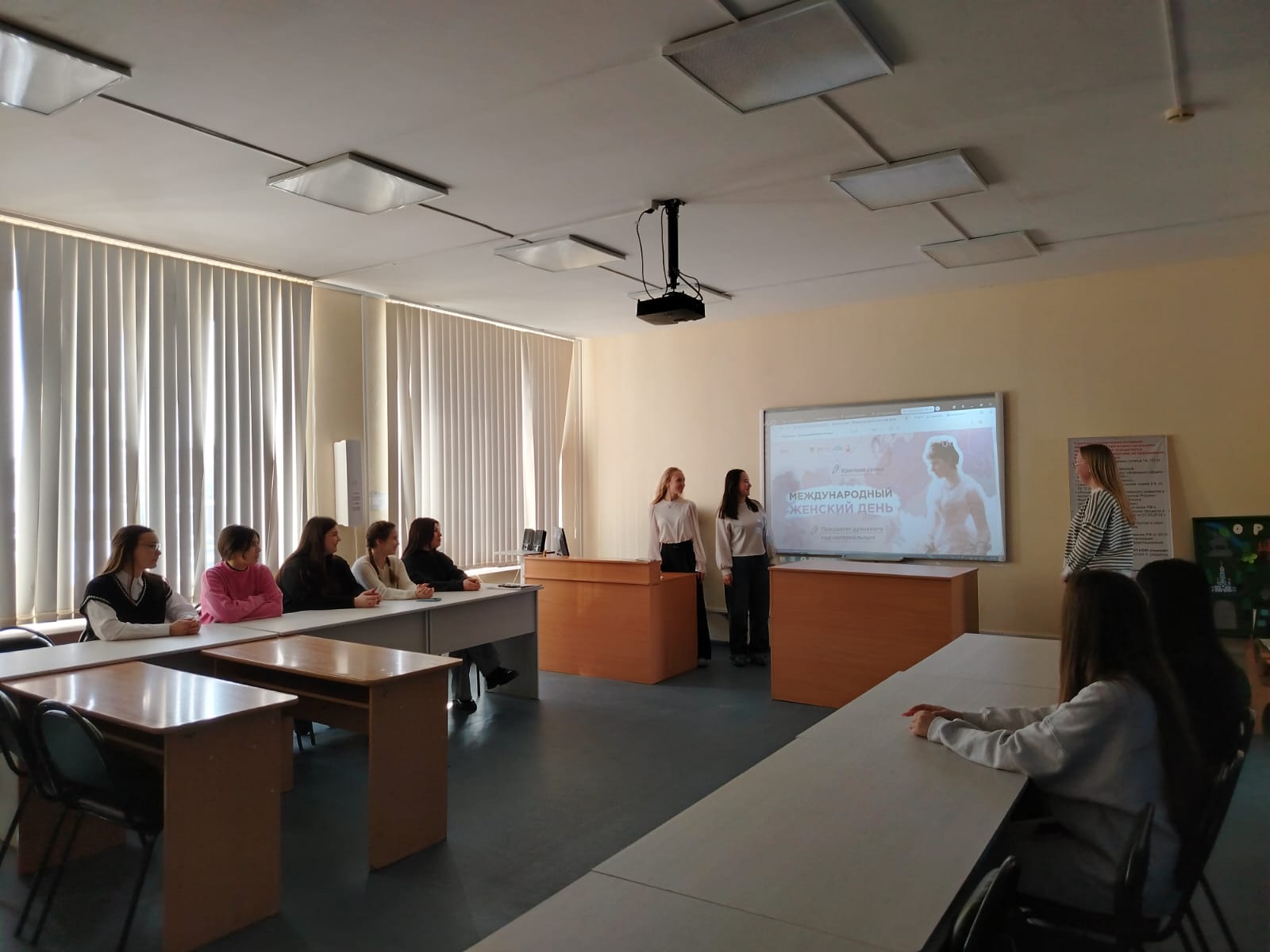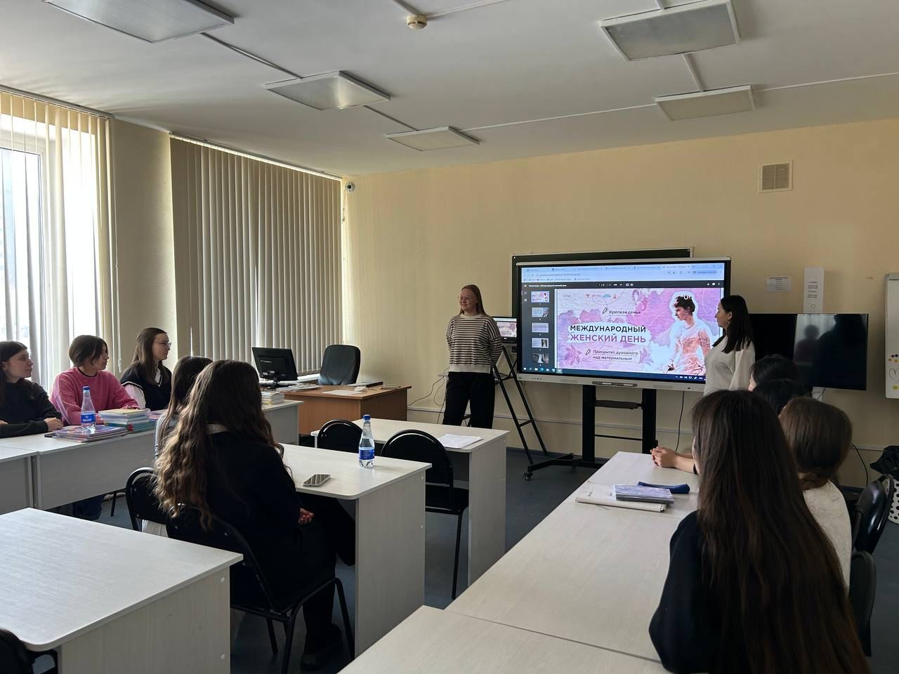 Цель: формирование и развитие у обучающихся первичных представлений о роли женщин в истории России, их вкладе в развитие различных сфер жизни и деятельности; формирование стремления к самореализации и служению обществу на примере выдающихся женщин России; воспитание ценностного отношения к семье и своим близким. На мероприятии была проведена беседа о том, что Международный женский день – это не только исторический символ борьбы за права, но и день признания вклада женщин в развитие института семьи, общества, науки, культуры и других сфер деятельности. Истории замечательных женщин России – это истории про стремление к мечте, преодоление трудностей и служение Отечеству. Вклад женщин в различные сферы жизни, такие как наука, техника, культура и экономика, имеет огромное значение и способствует развитию общества, обеспечивая равновесие, разнообразие и прогресс. Материнство, воспитание детей, забота о семье — важнейшие роли женщин в обществе. Современные женщины играют важную роль в жизнь страны, успешно сочетая рождение и воспитание детей, заботу о семье с работой в различных сферах и активным участием в общественной жизни. В мероприятии приняло участие более 50 студентов.