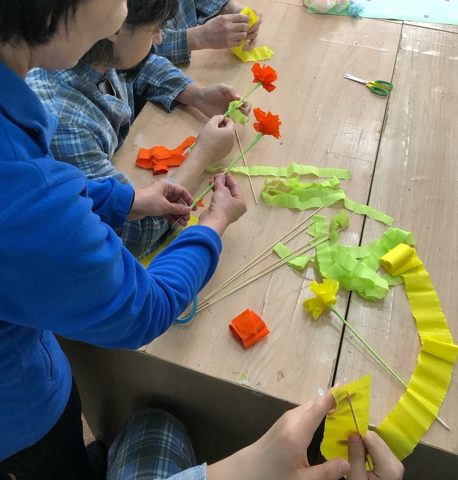 Затем, под руководством волонтеров, дети и подростки изготовили этот замечательный цветок своими руками во имя Памяти тех, кто подарил нам мирную жизнь.