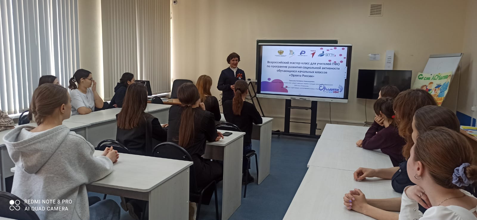 15 апреля 2025 года на кафедре теорий и методик начального образования состоялся Всероссийский мастер-класс для учителей ПФО по программе развития социальной активности обучающихся начальных классов «Орлята России» в очном и дистанционном формате. Спикер мероприятия, кандидат педагогических наук, доцент Савельева Екатерина Александровна рассказала о реализации масштабного всероссийского проекта для начальной школы по воспитанию активных граждан страны «Орлята России».