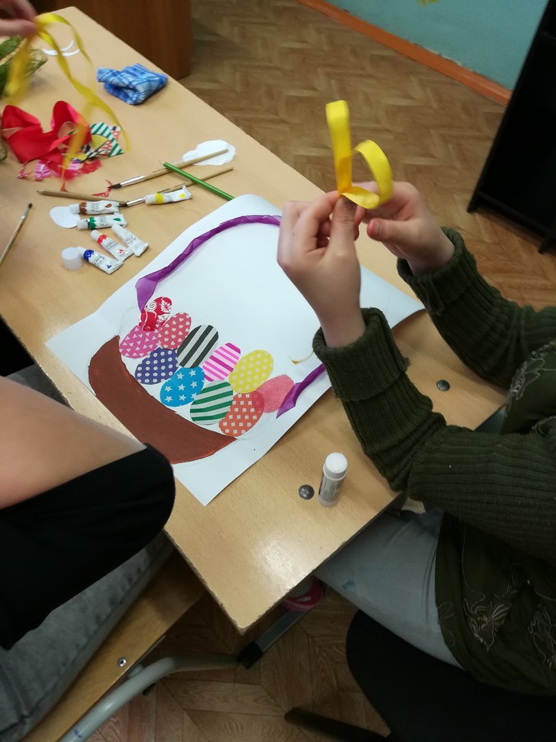 Регина Гареева: «Скоро праздник Пасхи, поэтому занятие с детьми я запланировала в виде аппликации, с украшением корзины, внутри которой будут уложены разноцветные пасхальные яйца. Все воспитанники работали творчески, с увлечением, вкладывая душу в процесс создания поделки.