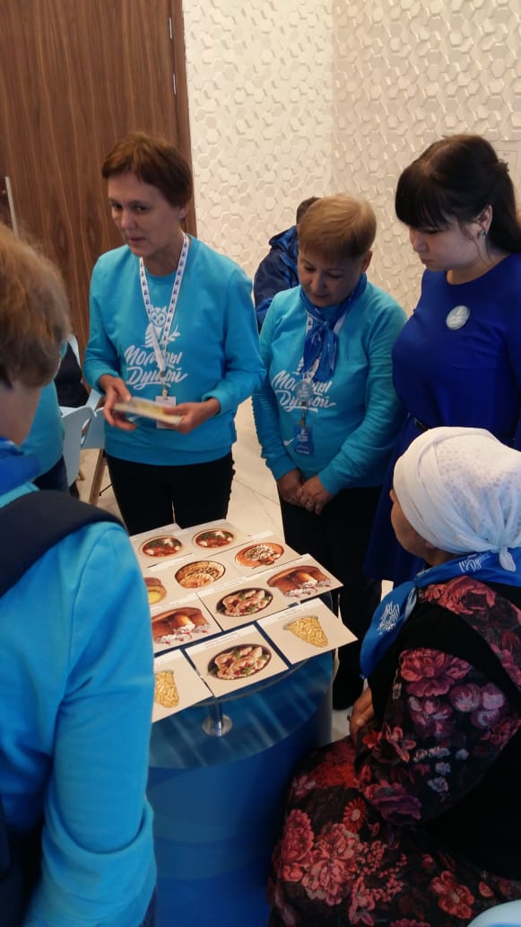Наставник проекта – «серебряный» волонтер, руководитель волонтерского отряда «Палитра», к.п.н., доц. кафедры теорий и методик начального образования БГПУ им. М. Акмуллы Екатерина Савельева  совместно с «серебряным» волонтером делегации Республики Башкортостан Лялей Абубакировой провели игру-лото «Национальные кухни Башкортостана». Участники мероприятия играли в лото, сочиняли загадки, развивали тактильные  ощущения. В играх приняло участие 25 человек, из них 24 - с нарушением зрения.