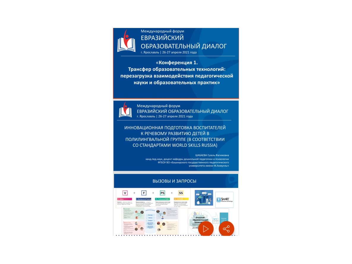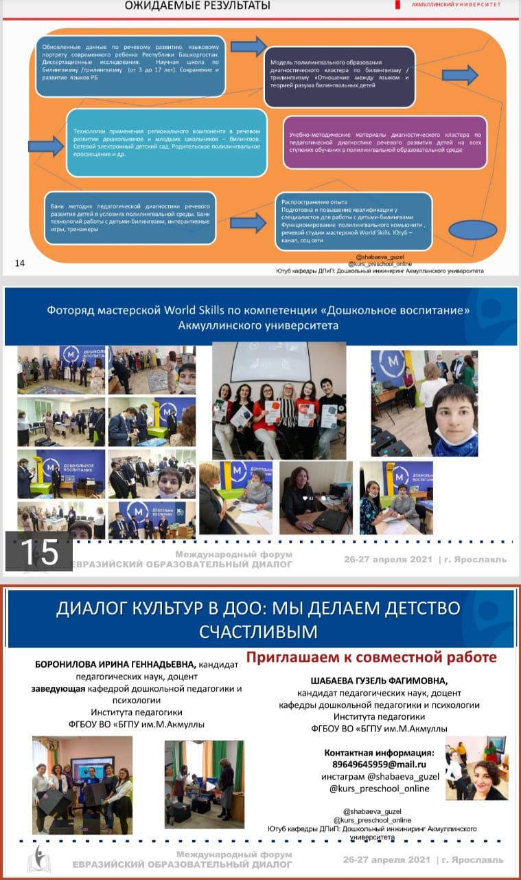 к.п.н., доц. Шабаева Г.Ф. приняла участие в Международном форуме с темой доклада "Инновационная подготовка воспитателей к речевому развитию детей в полилингвальной среде ДОО (в соответствии со стандартами World Skills). ГАУ ДПО ЯО «Институт развития образования»   26-27 апреля 2021 года в городе Ярославле Международного форума «ЕВРАЗИЙСКИЙ ОБРАЗОВАТЕЛЬНЫЙ ДИАЛОГ».