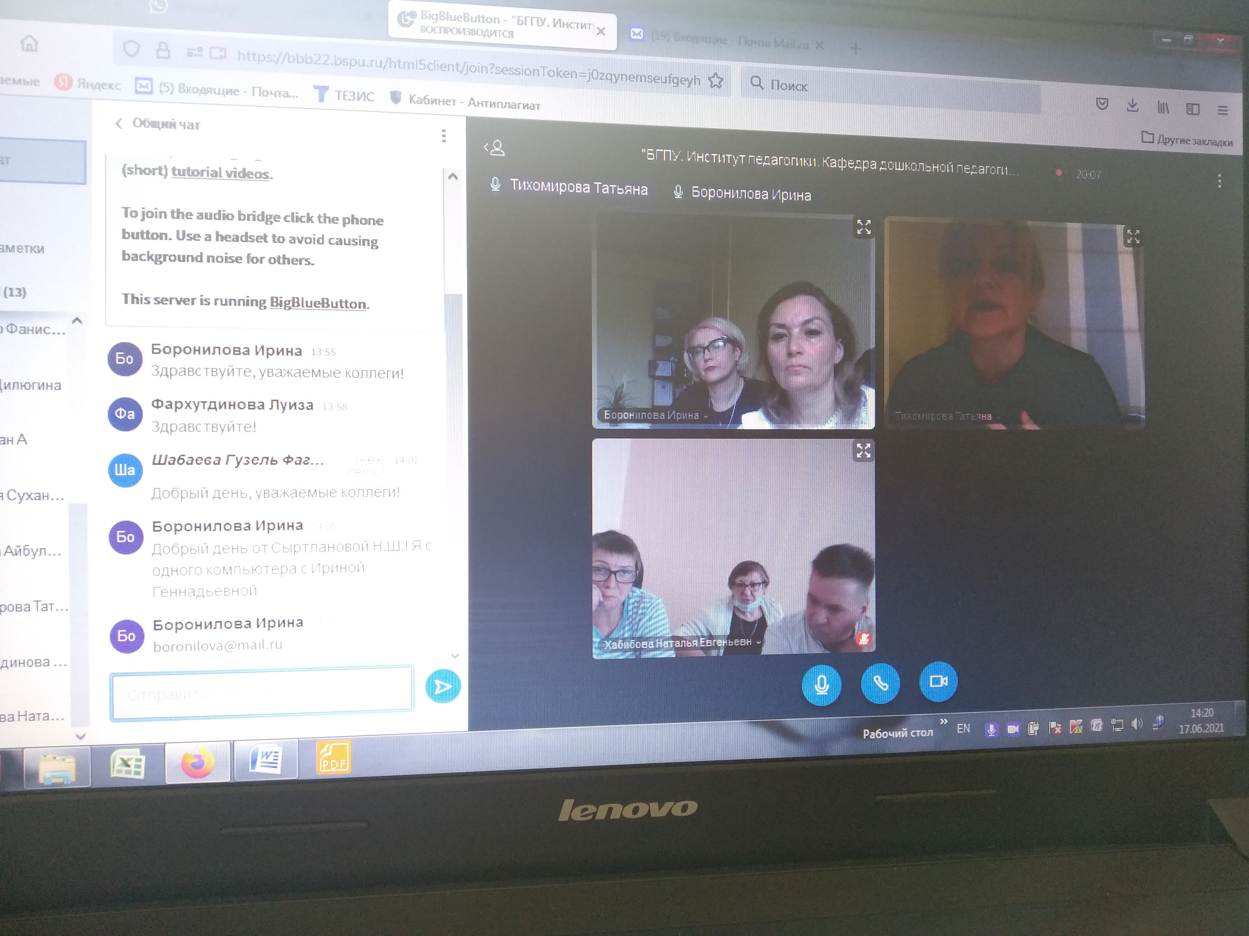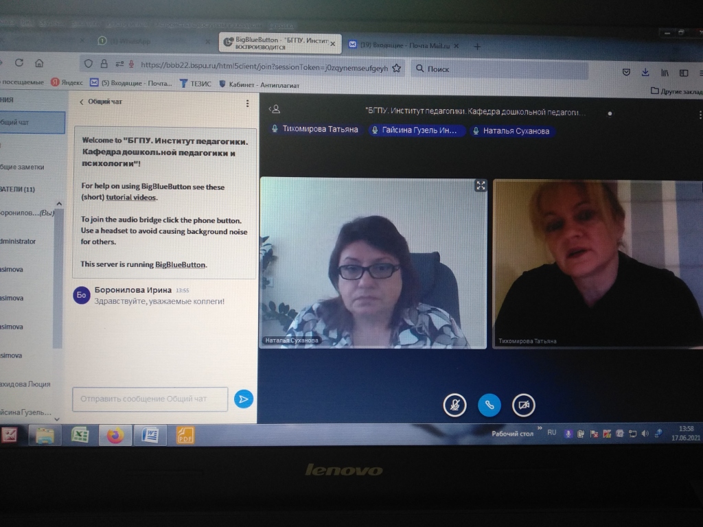 17.06.2021г. состоялось рабочее совещание по проекту приоритетного направления научных исследований БГПУ им. М.Акмуллы "Психолого-педагогические аспекты обучения детей в социолингвистическом пространстве Российской Федерации" (руководитель проекта – Тихомирова Татьяна Николаевна, главный научный сотрудник  БашНОЦ РАО, ответственный исполнитель – Боронилова Ирина Геннадьевна, заведующий кафедрой дошкольной педагогики и психологии). В совещании приняли участие : проректор по научной деятельности Суханова Н.В., руководитель проекта Тихомирова Т.Н., участники 12 проектных групп. В ходе совещания обсуждались достигнутые результаты работы за текущий год и перспективы развития проекта, обозначены направления исследований на 2021-22 учебный год.