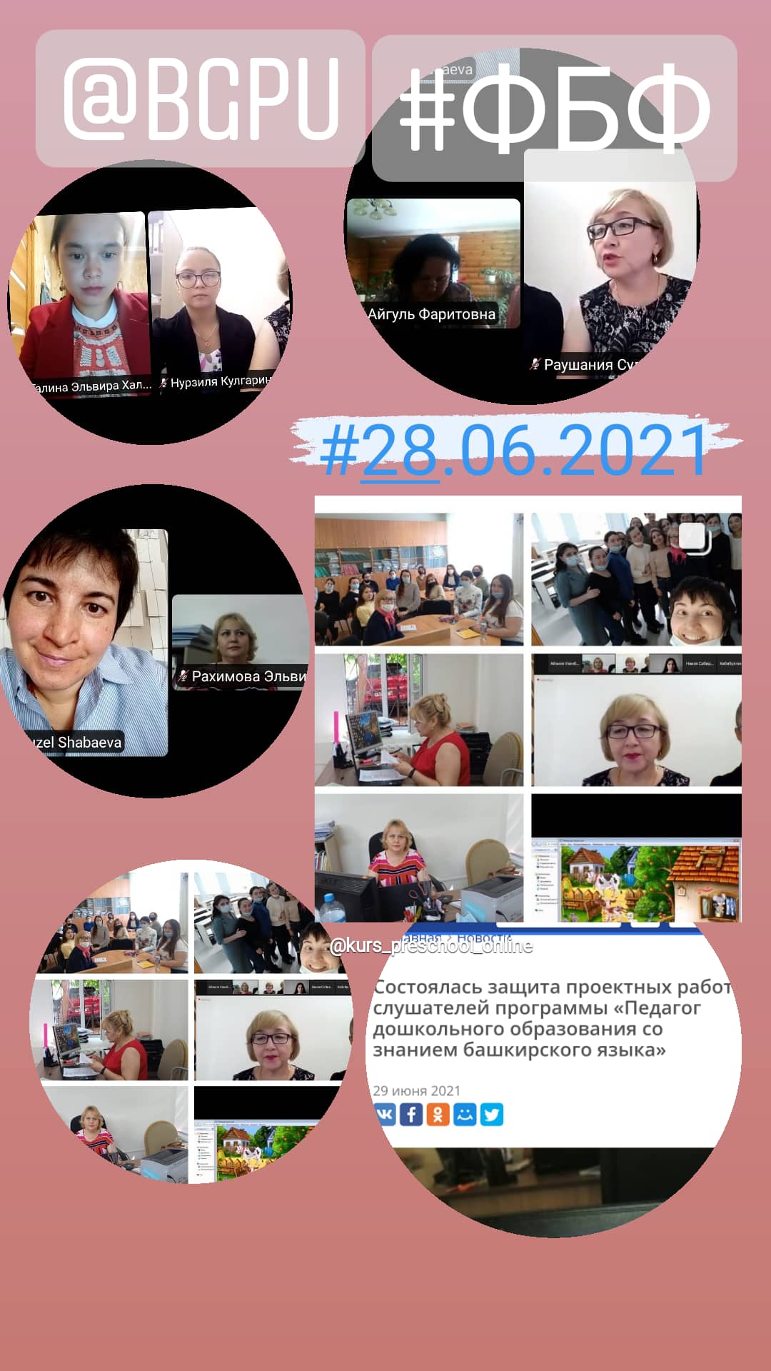28 июня  2021 г. в Институте непрерывного профессионального образования «Вектор развития»  БГПУ им. М. Акмуллы состоялась защита итоговых аттестационных работ в форме коллективных  проектов слушателей, прошедших  обучение по программе профессиональной переподготовки «Педагог дошкольного образования со знанием башкирского языка». Защита состоялась на онлайн-платформе ZOOM.