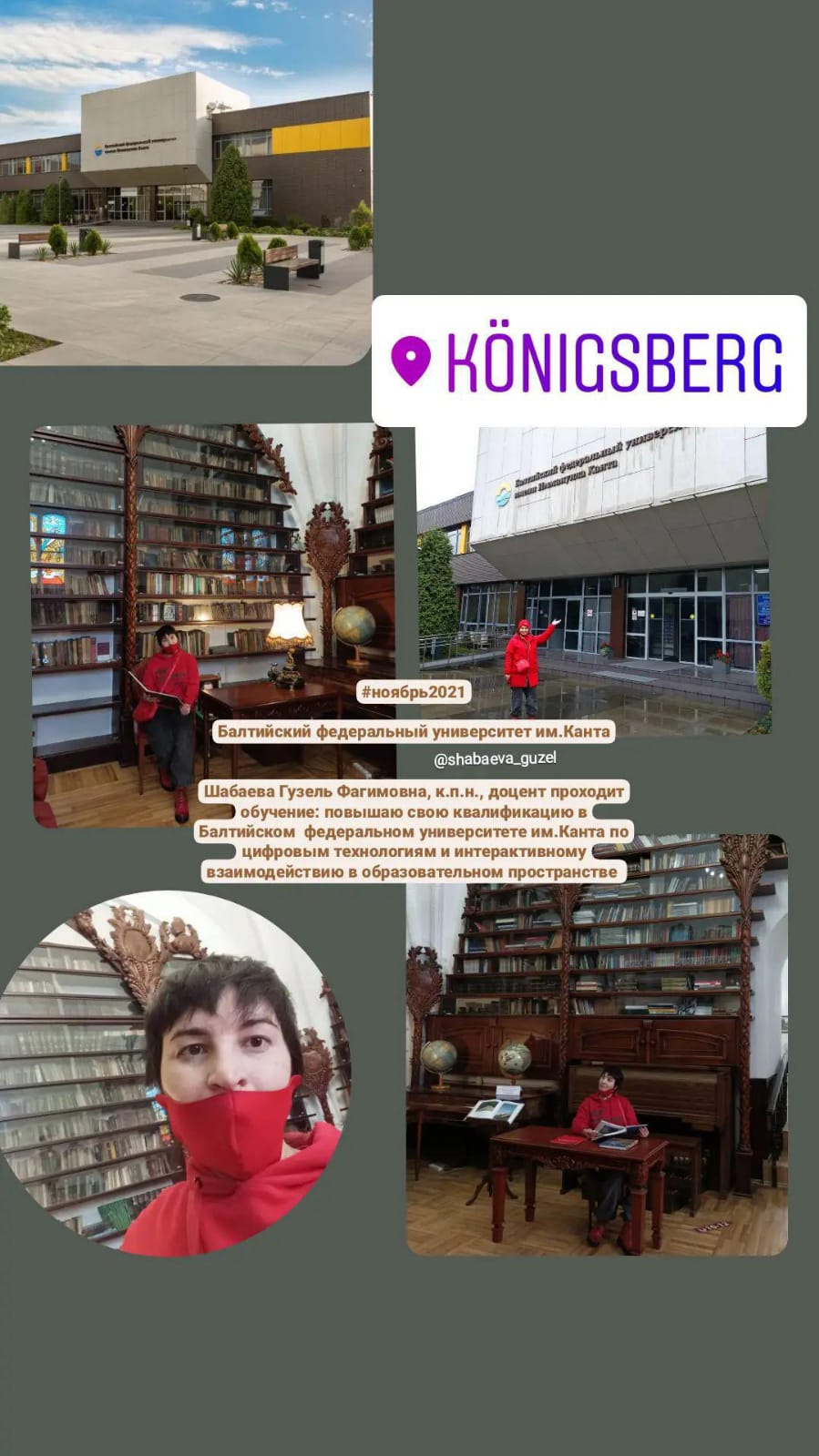 Шабаева Гузель Фагимовна кан. пед. наук, доцент кафедры Дошкольной педагогики и психологии проходит обучение по повышению квалификации в Балтийском  федеральном университете им.Канта по цифровым технологиям и интерактивному взаимодействию в образовательном пространстве.