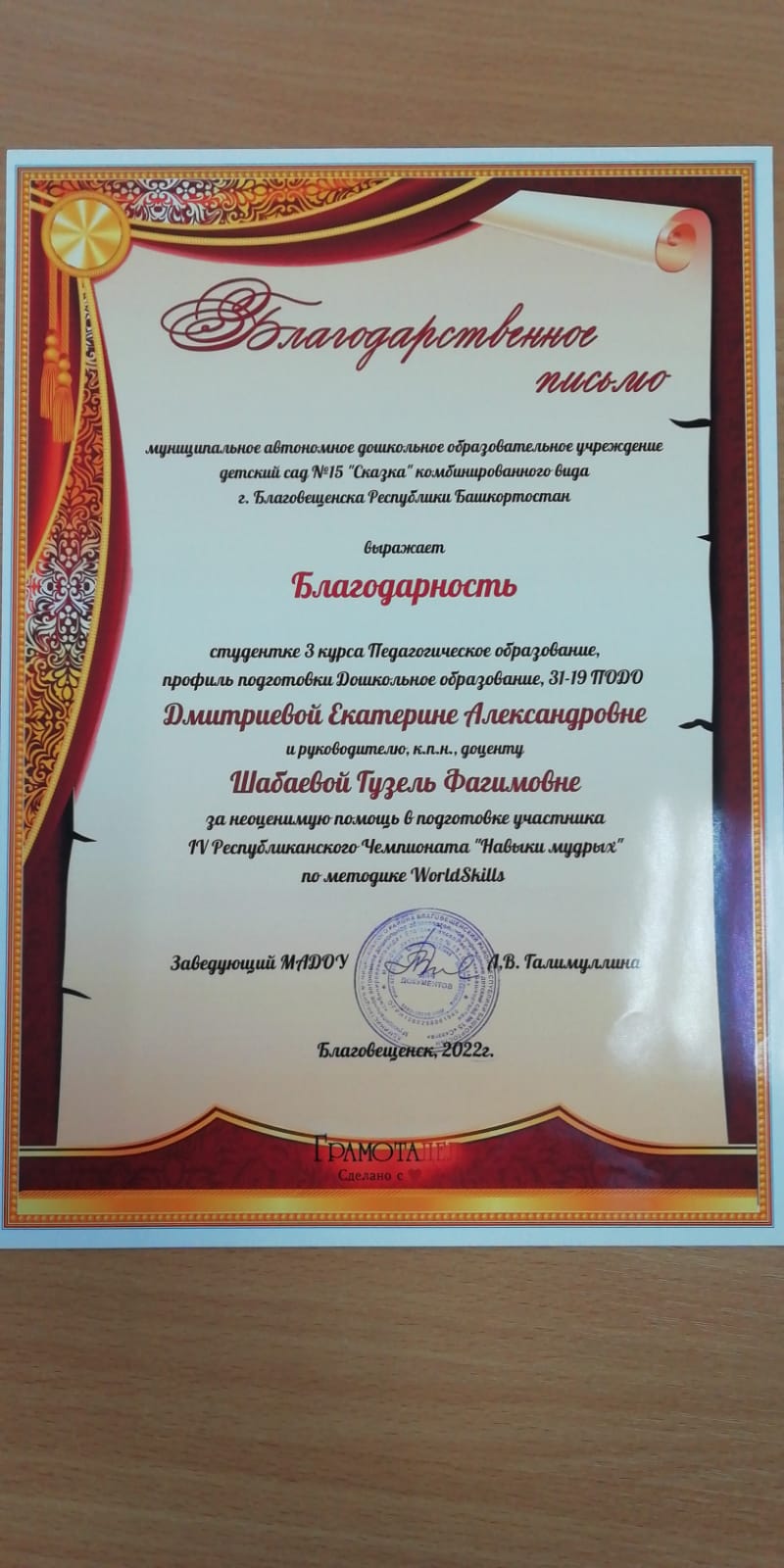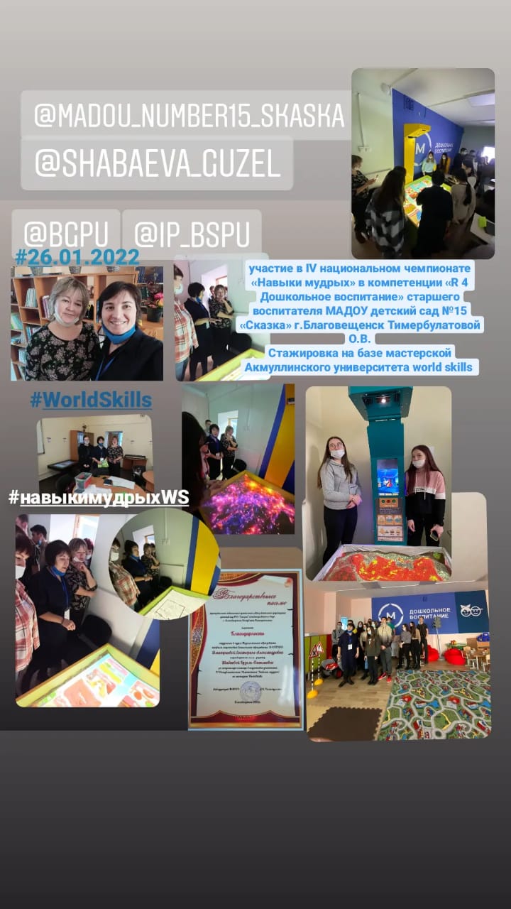 По запросу от МАДОУ д/с15 г. Благовещенск в связи с участием в IV национальном чемпионате «Навыки мудрых» в компетенции «R 4 Дошкольное воспитание» старшего воспитателя МАДОУ детский сад №15 «Сказка» г.Благовещенск Тимербулатовой О.В., руководителем инновационной площадки к.п.н., доцентом Шабаевой Гузель Фагимовны организованна стажировочная деятельность с интерактивным оборудованием  на базе мастерской World skills БГПУ им. Акмуллы кафедры «дошкольной педагогики и психологии» института педагогики под руководством заведующей кафедрой ДПиП Акмуллинского университета Борониловой И.Г. Успешно провели совместно с 3 курсом ПО ДО  консультацию по подготовке к чемпионату «WorldSkills Russia», проводимому в феврале 2022 г. в г.Стерлитамак.