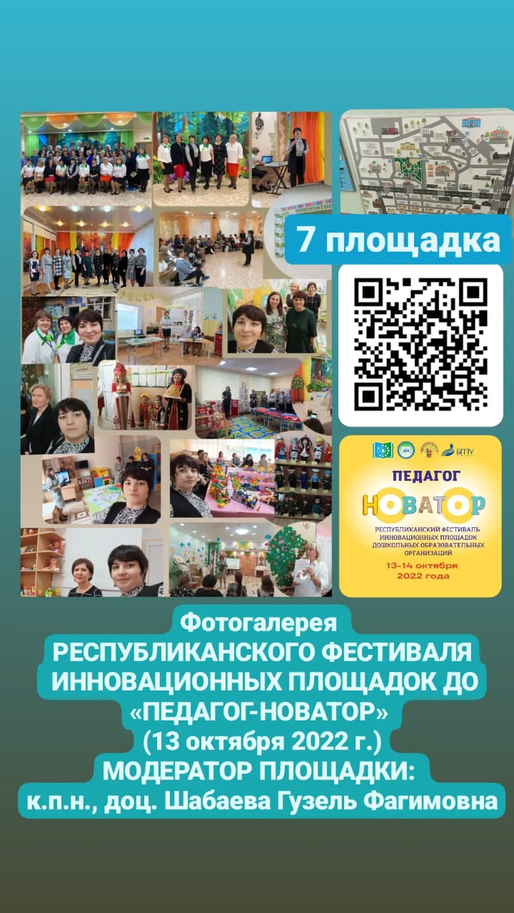 13.10.2022 успешно показала инновационный опыт Площадка № 7 г.Благовещенск РБ по теме: "Современные технологии патриотического и экологического воспитания в практике работы дошкольных образовательных организаций"  РЕСПУБЛИКАНСКОГО ФЕСТИВАЛЯ  ИННОВАЦИОННЫХ ПЛОЩАДОК ДОШКОЛЬНОГО ОБРАЗОВАНИЯ «ПЕДАГОГ-НОВАТОР» (13 октября 2022 г.)