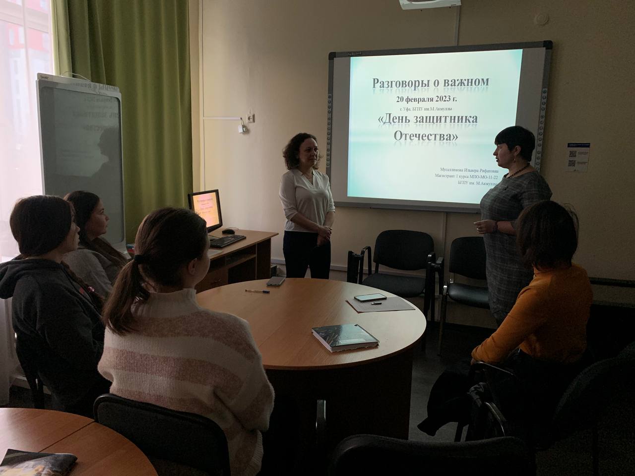20.02.2023г. магистранты 1 курса группы МПОМО-11-22 Мусаллямова Ильвера Рифатовна, Гоголева Гульнара Магдановна  провели со студентами 2 курса ПО Баш.яз. дошкольное образование, 4 курс ПО- ДО мероприятие в рамках Всероссийского проекта "Разговоры о важном".