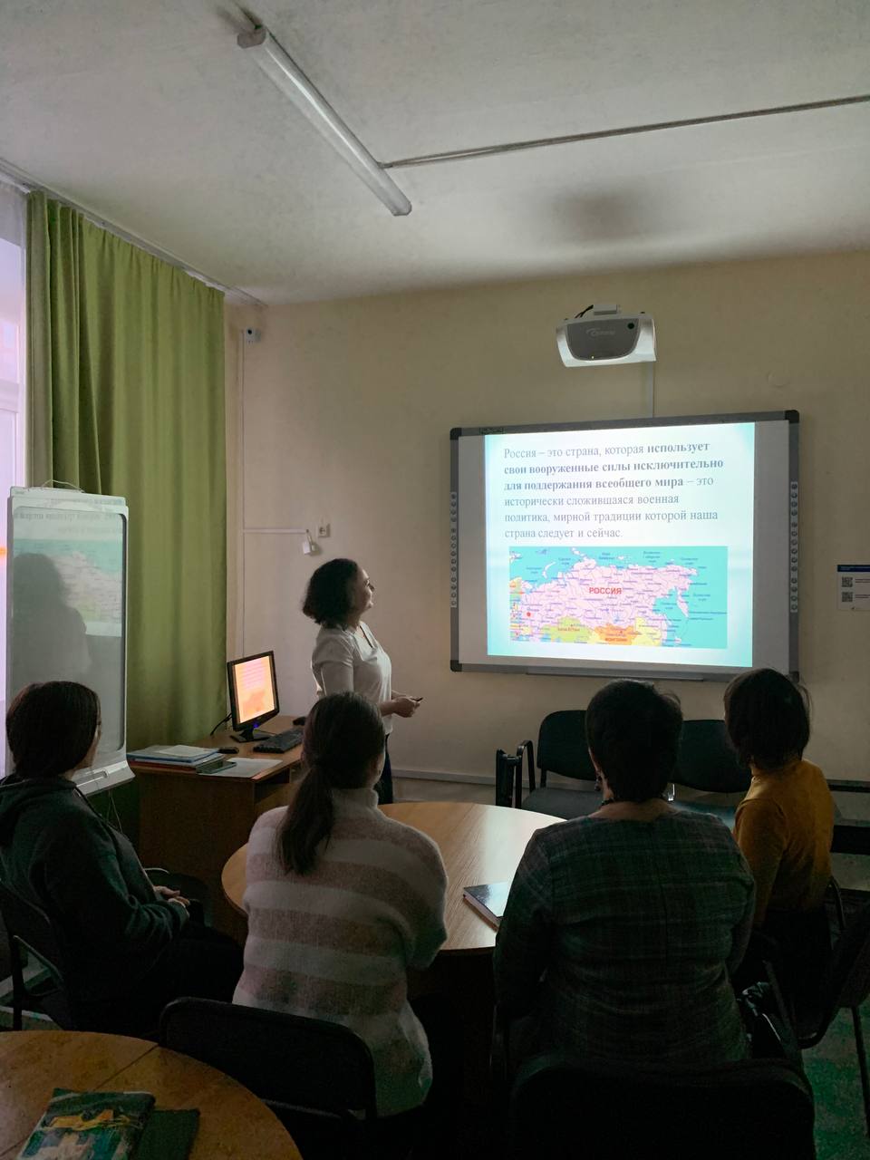 В ходе занятия просматривали и анализировали  видеоролики об истории Дня защитника Отечества, о профессии военного, о роли армии в защите страны и ее миротворческой миссии. Вынесли вопросы на обсуждение о том, какие ценности характеризуют русских воинов, делают русскую армию великой и непобедимой. Беседовали об особенностях военной доктрины России.