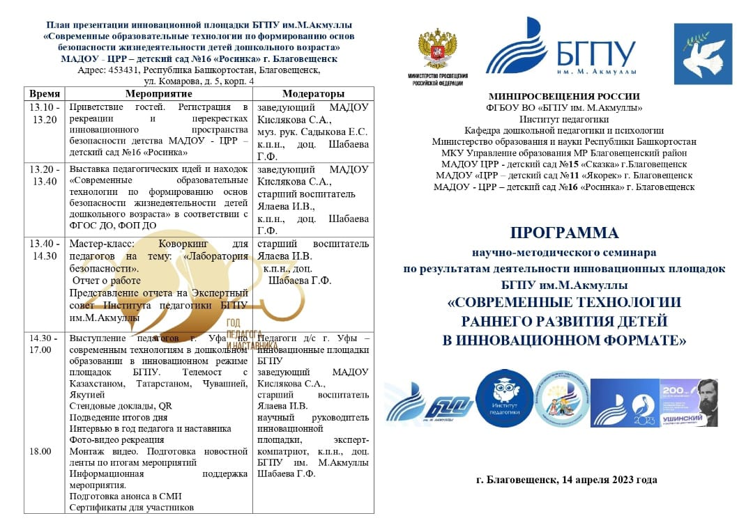 14 апреля 2023 г. при поддержке МИНПРОСВЕЩЕНИЯ РОССИИ, ФГБОУ ВО «БГПУ им. М.Акмуллы», Министерство образования и науки Республики Башкортостан, МКУ Управление образования МР Благовещенский район на базах МАДОУ детский сад №15 «Сказка»,  МАДОУ детский сад №11 "Якорек", МАДОУ детский сад №16 "Росинка" г.Благовещенск пройдет научно-методический семинар и Всероссийский конкурс методических разработок  по результатам деятельности инновационных площадок БГПУ им.М.Акмуллы «СОВРЕМЕННЫЕ ТЕХНОЛОГИИ РАННЕГО РАЗВИТИЯ ДЕТЕЙ В ИННОВАЦИОННОМ ФОРМАТЕ».