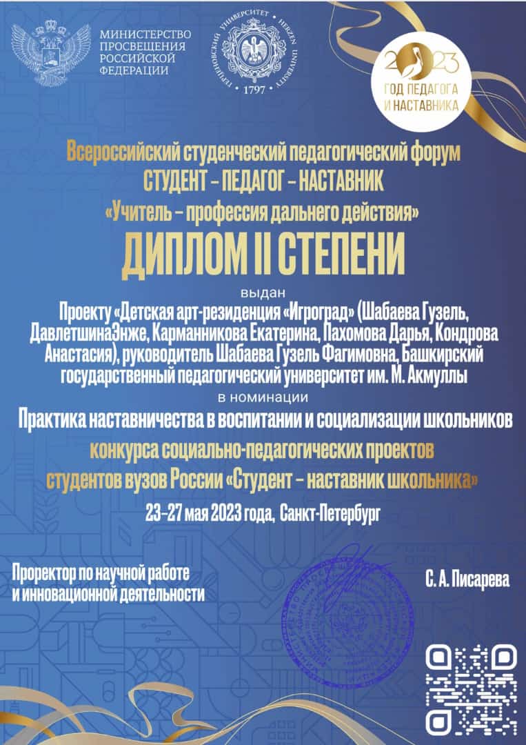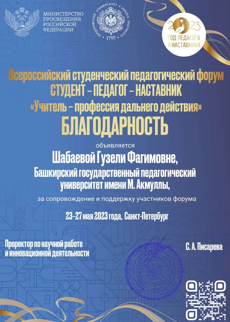 На базе РГПУ им. А. И. Герцена  Всероссийский студенческий педагогический  форум: студент-педагог-наставник «Учитель – профессия дальнего действия», который проводился с 23 по 27 мая 2023 г. в Год педагога и наставника и 200-летнего юбилея К. Д. Ушинского. Диплом победителя 2 степени , благодарственные письма , сертификаты получены 03.07.2023