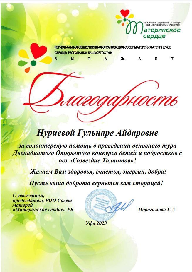12.09. 2023 г. прошел основной тур Двенадцатого Открытого конкурса детей и подростков с ОВЗ "Созвездие Талантов", организованного региональной общественной организацией Совета матерей "Материнское сердце" Республики Башкортостан.