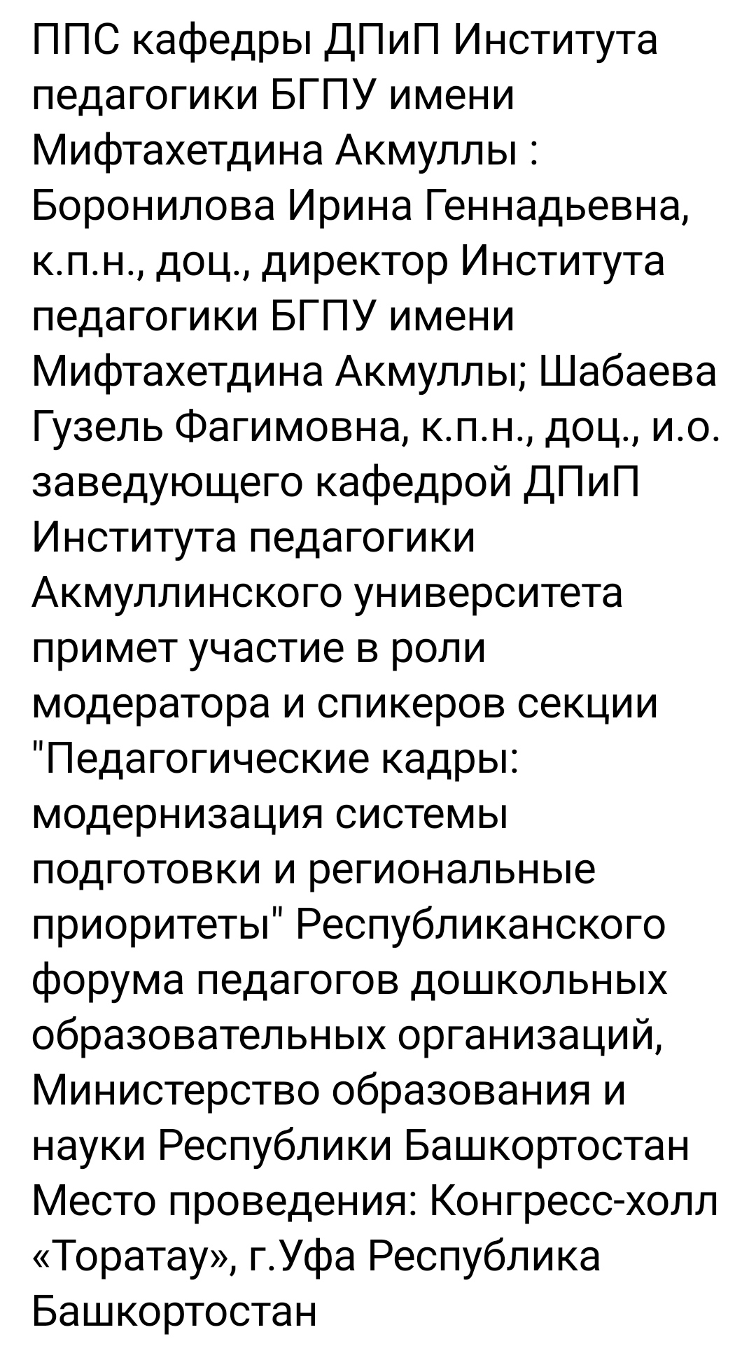 ППС и студенты  кафедры ДПиП Института педагогики БГПУ имени Мифтахетдина Акмуллы : Боронилова Ирина Геннадьевна, к.п.н., доц., директор Института педагогики БГПУ имени Мифтахетдина Акмуллы; Шабаева Гузель Фагимовна, к.п.н., доц., и.о. заведующего кафедрой ДПиП Института педагогики Акмуллинского университета примет участие в роли модератора и спикеров секции,
