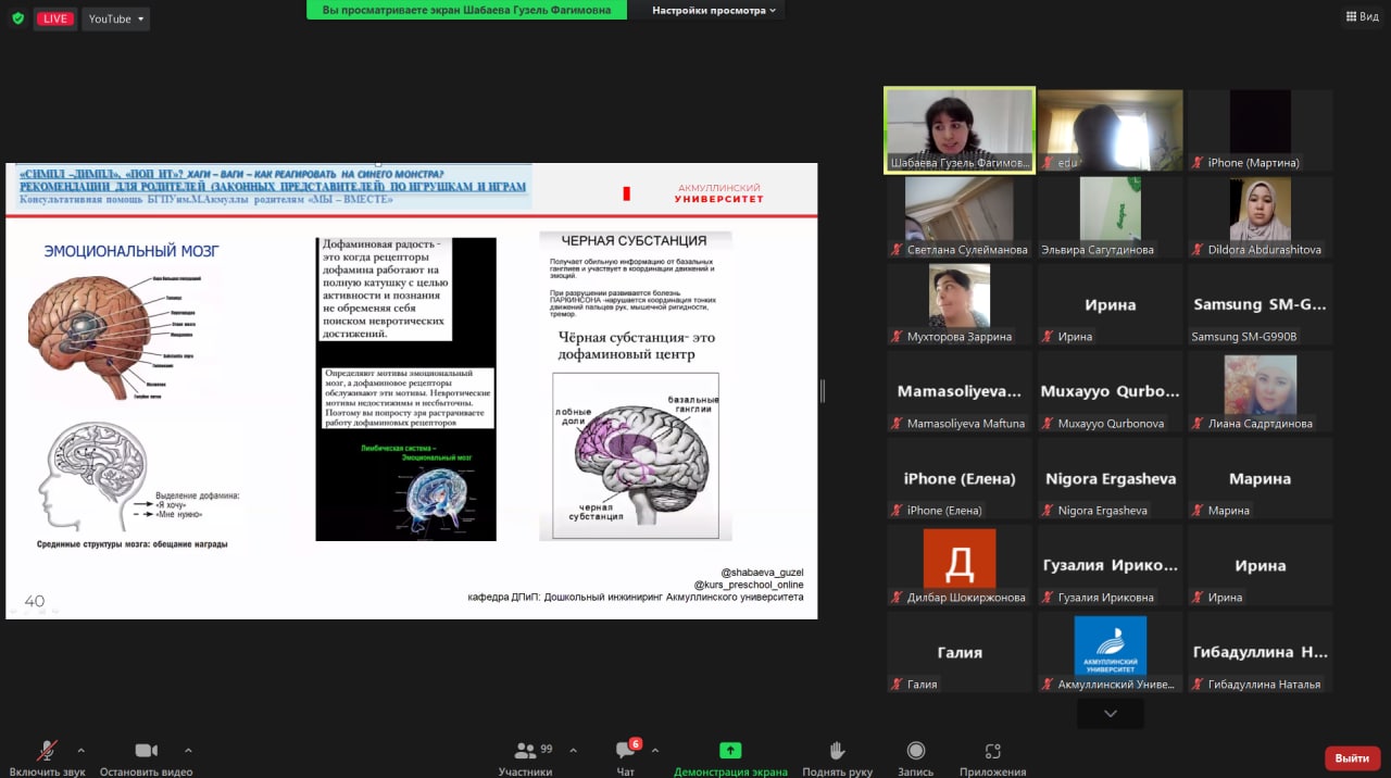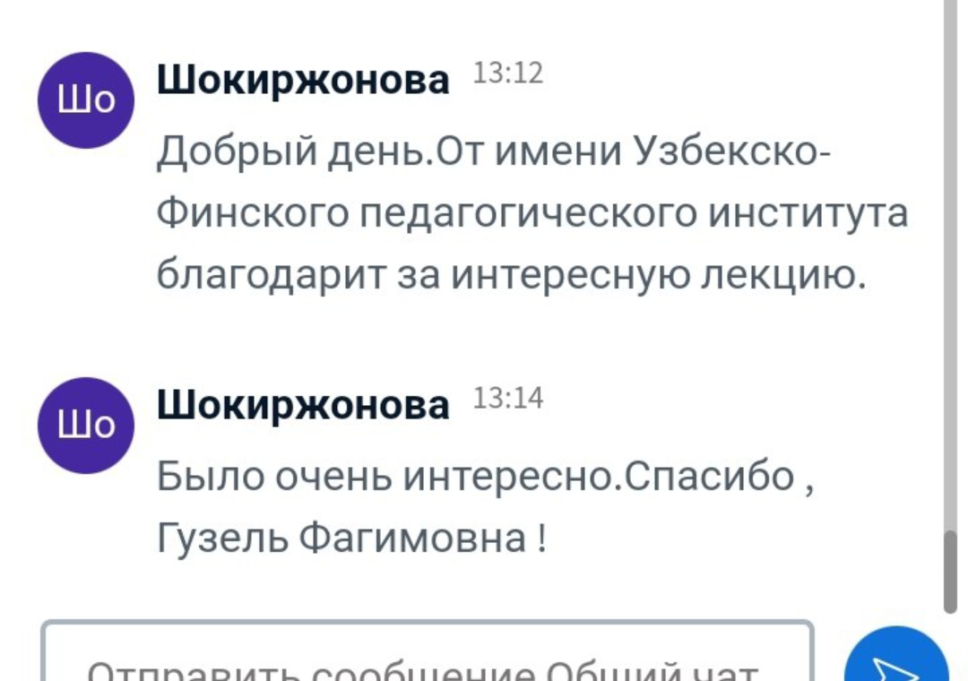 Шабаева Г.Ф., к.п.н., доц., и.о. заведующего кафедрой ДПиП Института педагогики БГПУ имени Мифтахетдина Акмуллы приняла участие в мероприятии, как научный руководитель магистрантов , совместных международных научных проектов СГУ г. Самарканда и БГПУ имени М.Акмуллы, г.Уфа. Систематически БГПУ получает положительные отзывы и отклики о совместных проектах, лекциях, слова благодарности о конструктивном , профессиональном научном сопровождении Шабаевой Г.Ф.