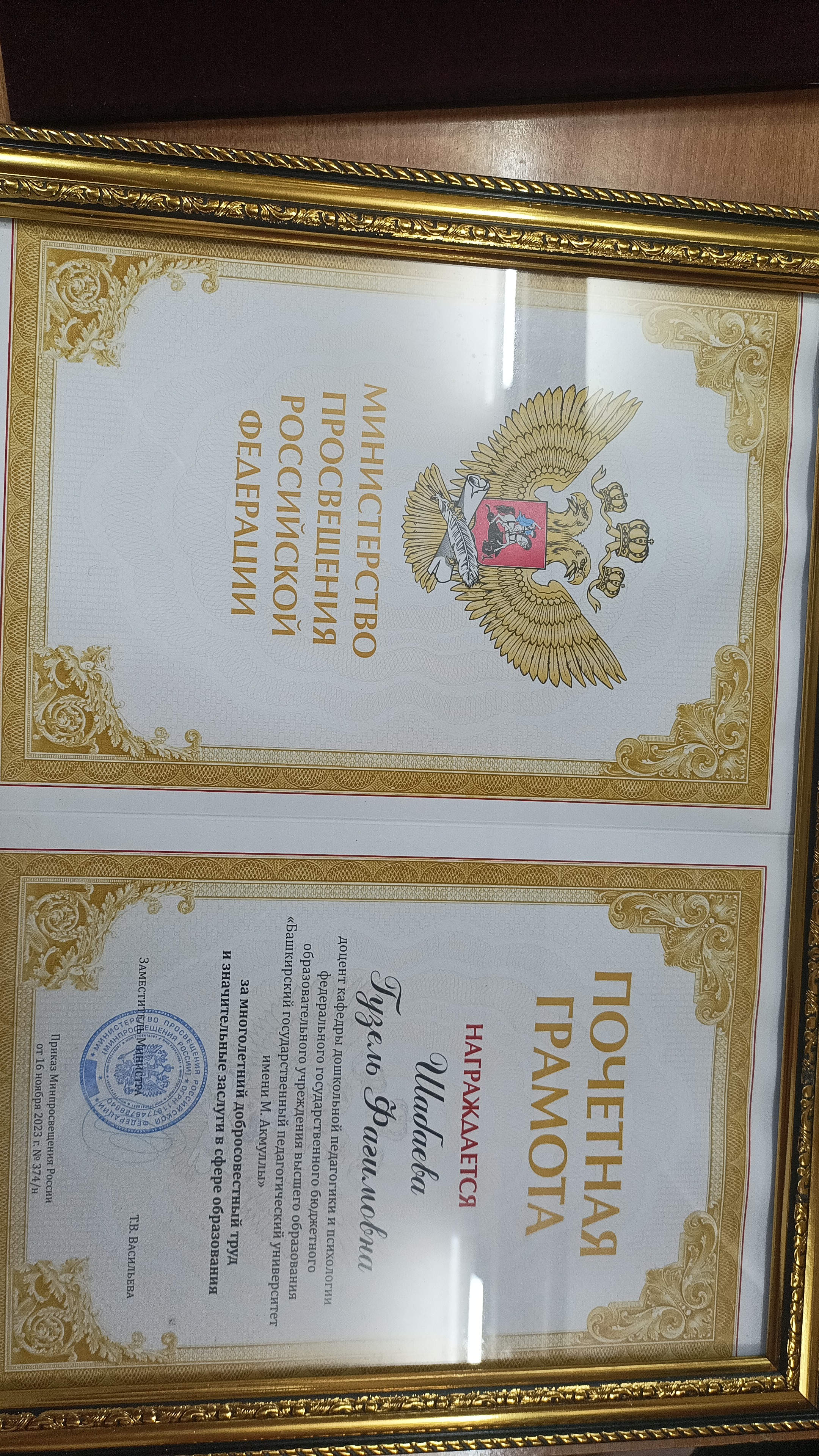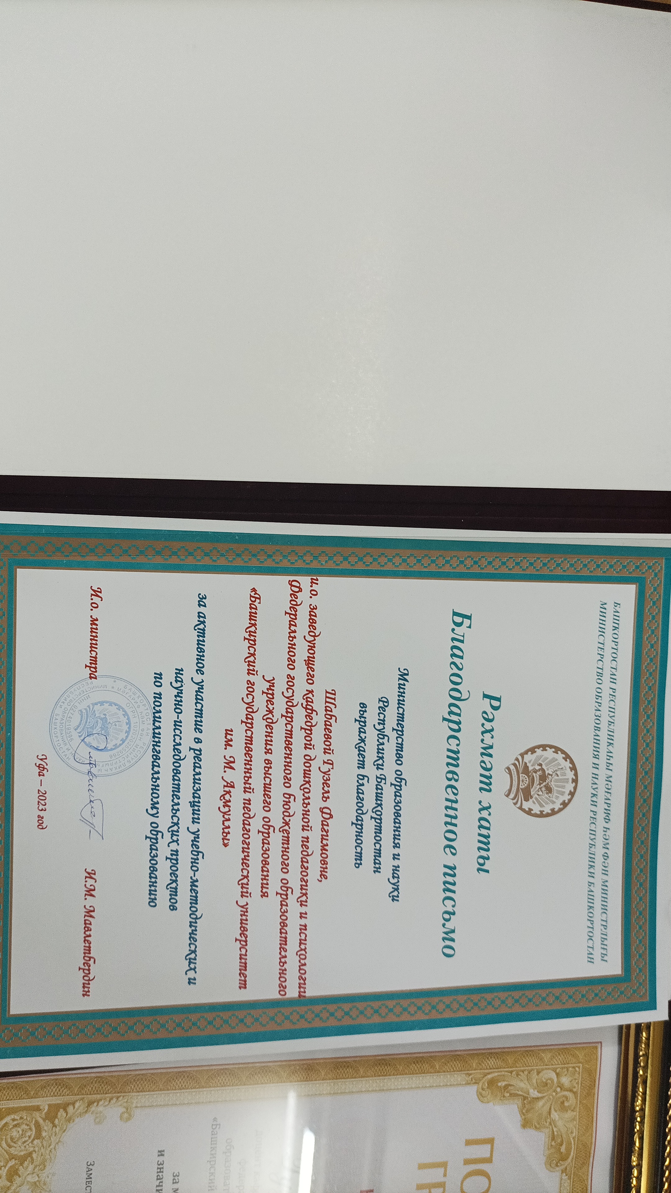 Вручил почетную грамоту Министерства просвещения Российской Федерации и благ письмо Министерства образования и науки Республики Башкортостан Шабаевой Г.Ф.