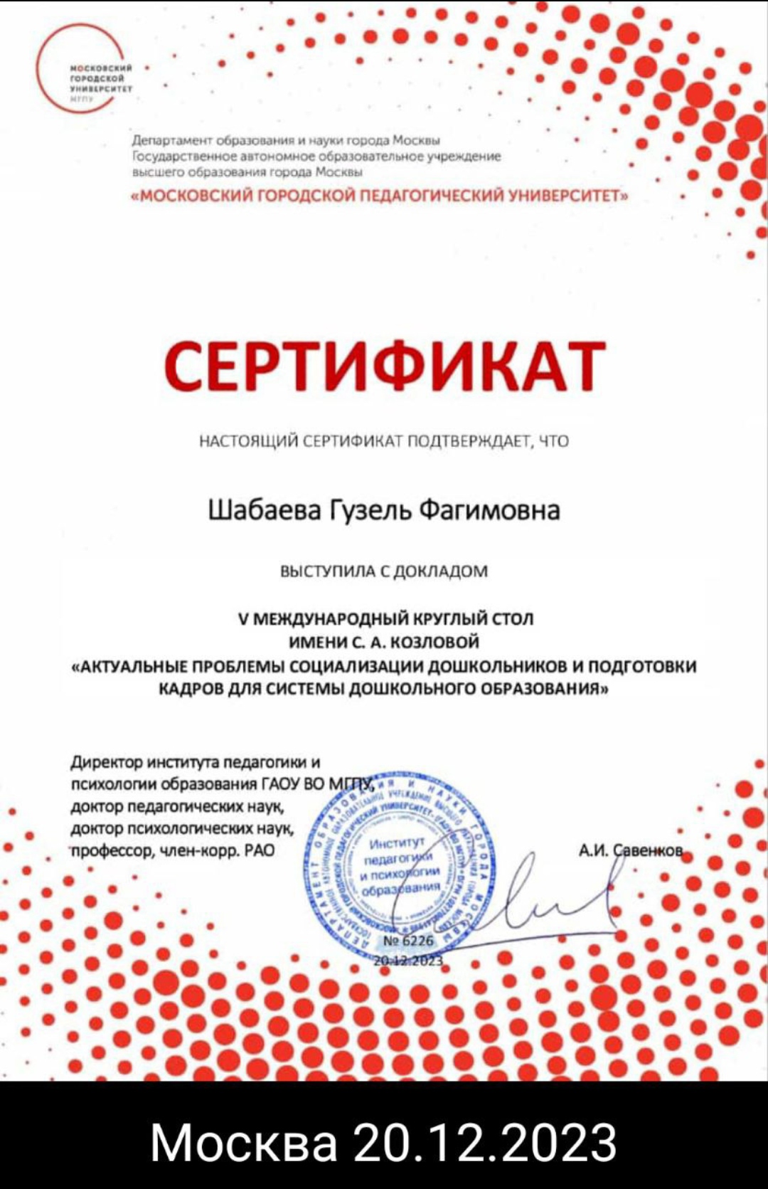 Шабаева Г.Ф. спикер V Международного круглого стола имени С.А. Козловой «Московский городской педагогический университет» Институт педагогики и психологии образования