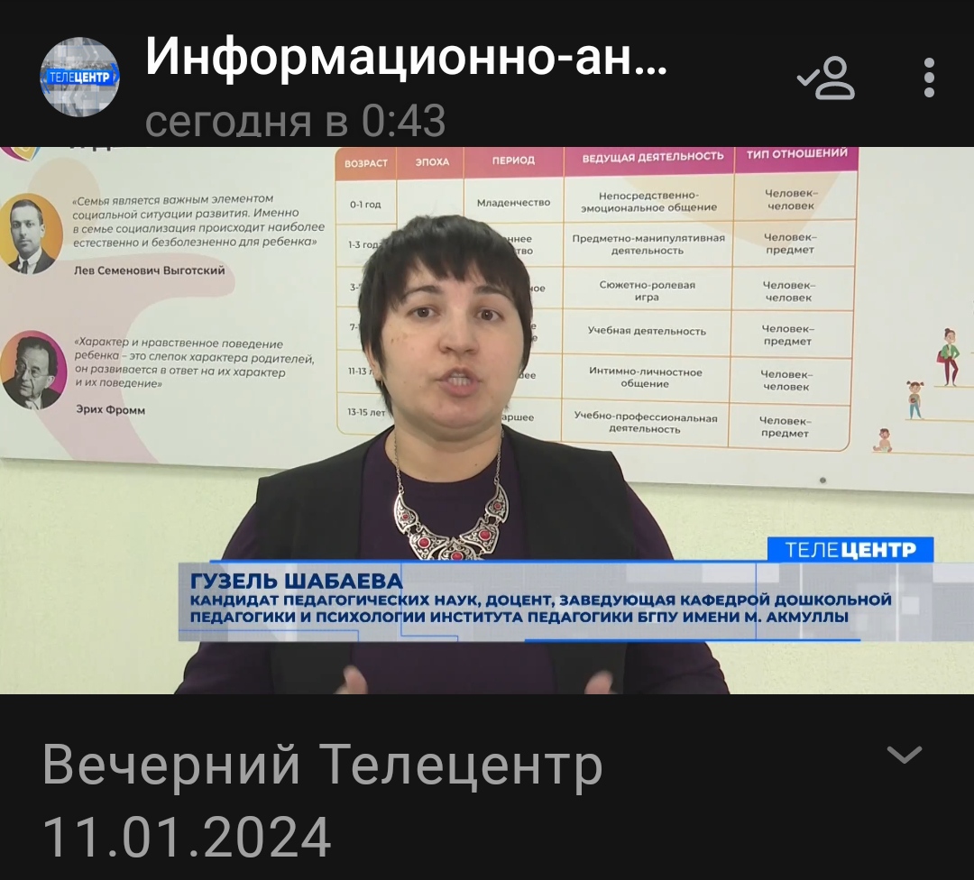 Шабаева Гузель Фагимовна, кандидат педагогических наук, доцент, дала интервью корреспондентам Вечернего телецентра и высказала экспертное мнение по поводу инициативного, активного родительства, организацию психолого-педагогическое консультирования, про зимние Умные каникулы в БГПУ