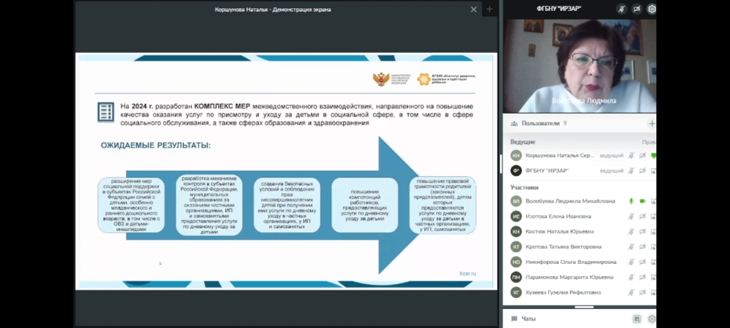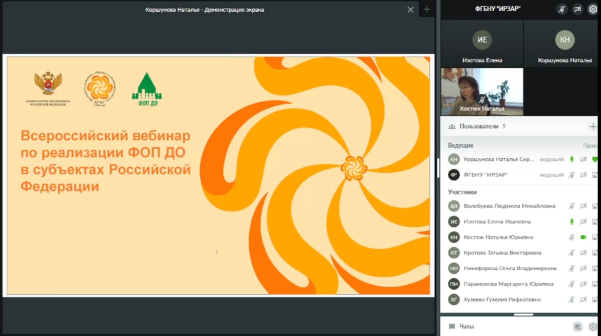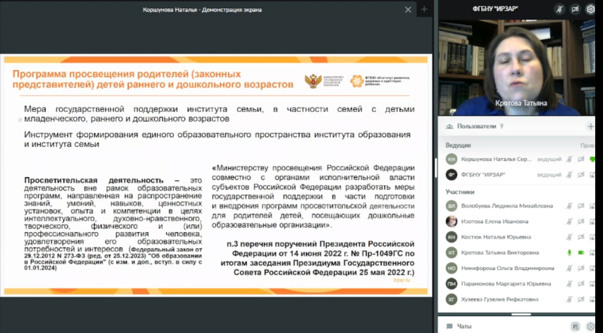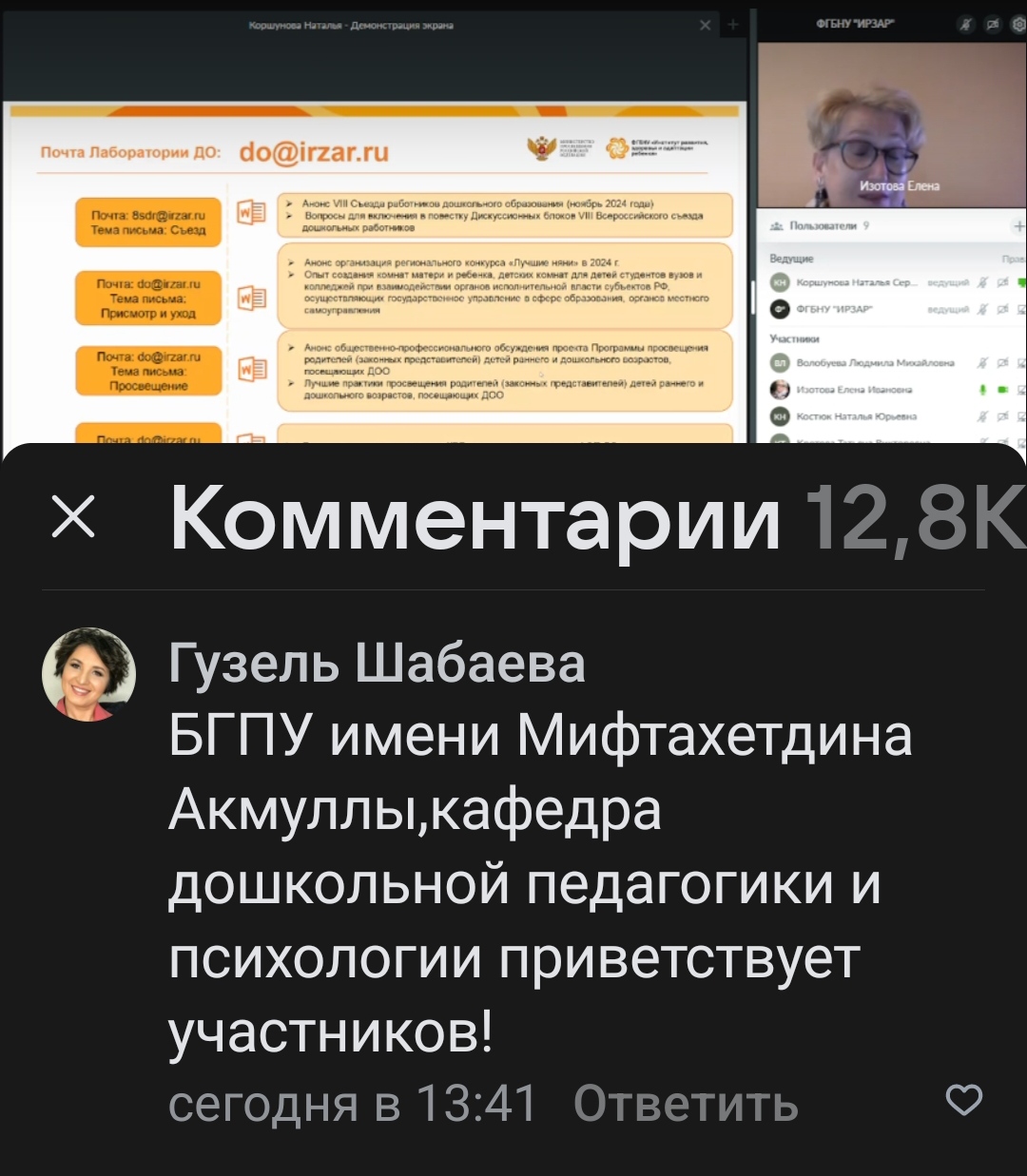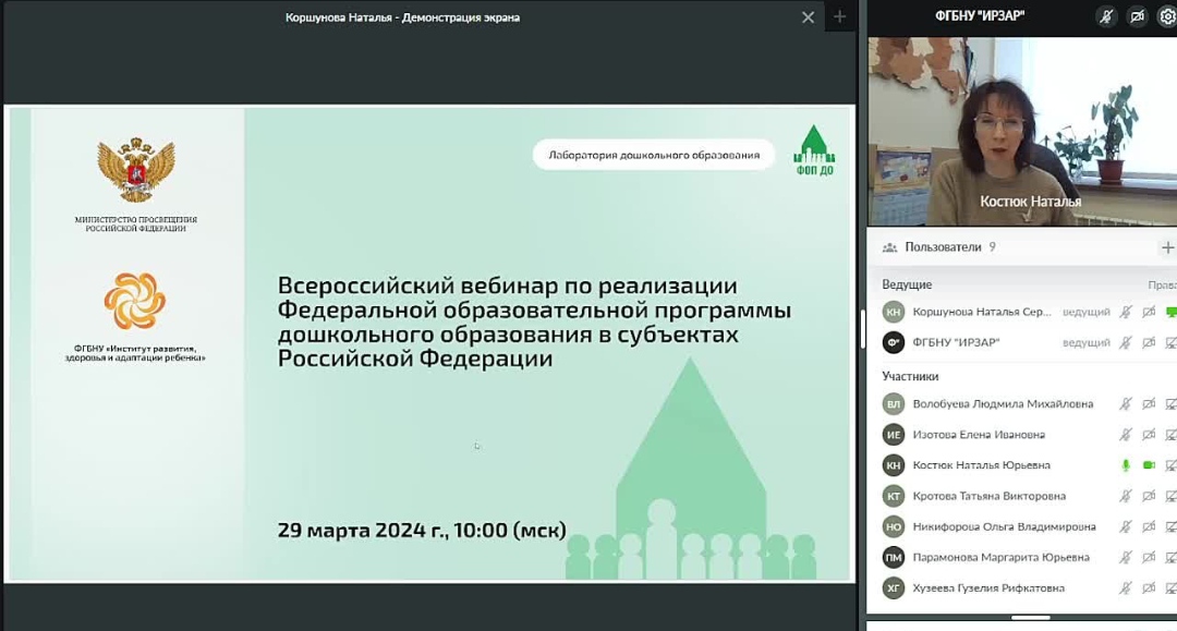 В вебинаре приняли участие представители Министерства просвещения Российской Федерации, сотрудники Лаборатории дошкольного образования ФГБНУ «Институт развития, адаптации и здоровья ребенка», преподаватели кафедры ДПиП Института педагогики Акмуллинского университета.