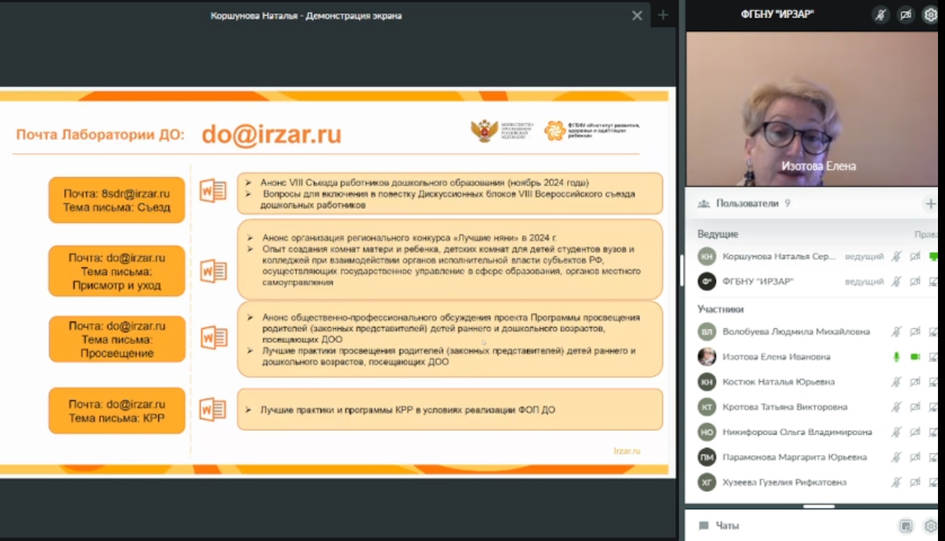 На вебинаре  обсуждались вопросы реализации Федеральной образовательной программы дошкольного образования, подготовки VIII всероссийского съезда дошкольных работников, оптимизации присмотра и ухода за детьми раннего и дошкольного возраст, внедрения программы просвещения родителей (законных представителей) детей дошкольного возраста в образовательную практику ДОО, определения целевых групп обучающихся дошкольного возраста и индивидуализации их образовательных маршрутов.