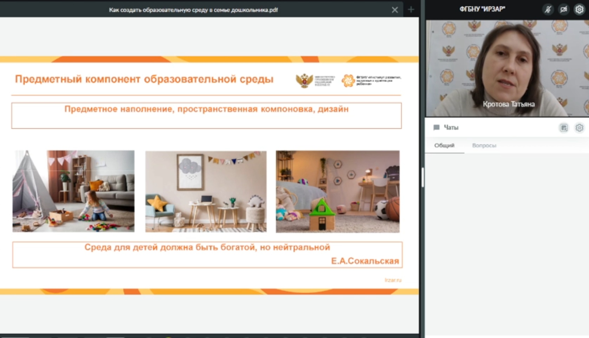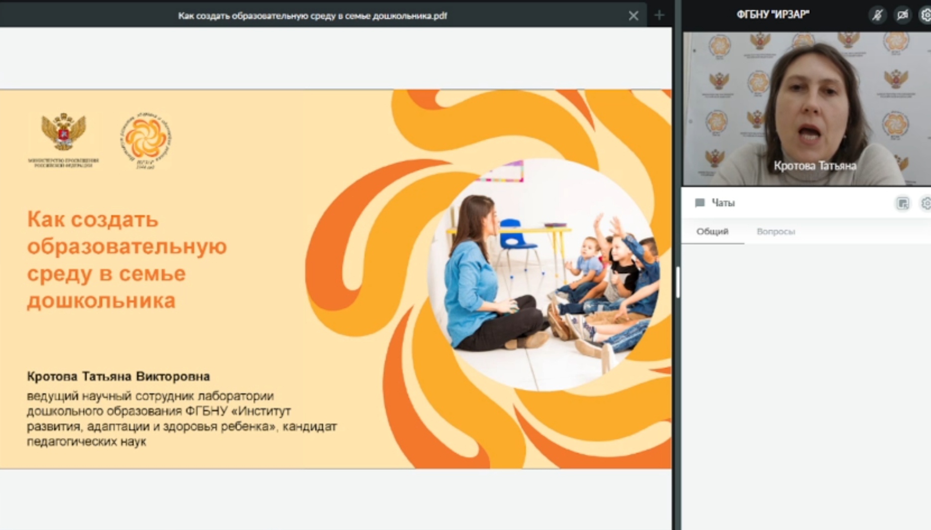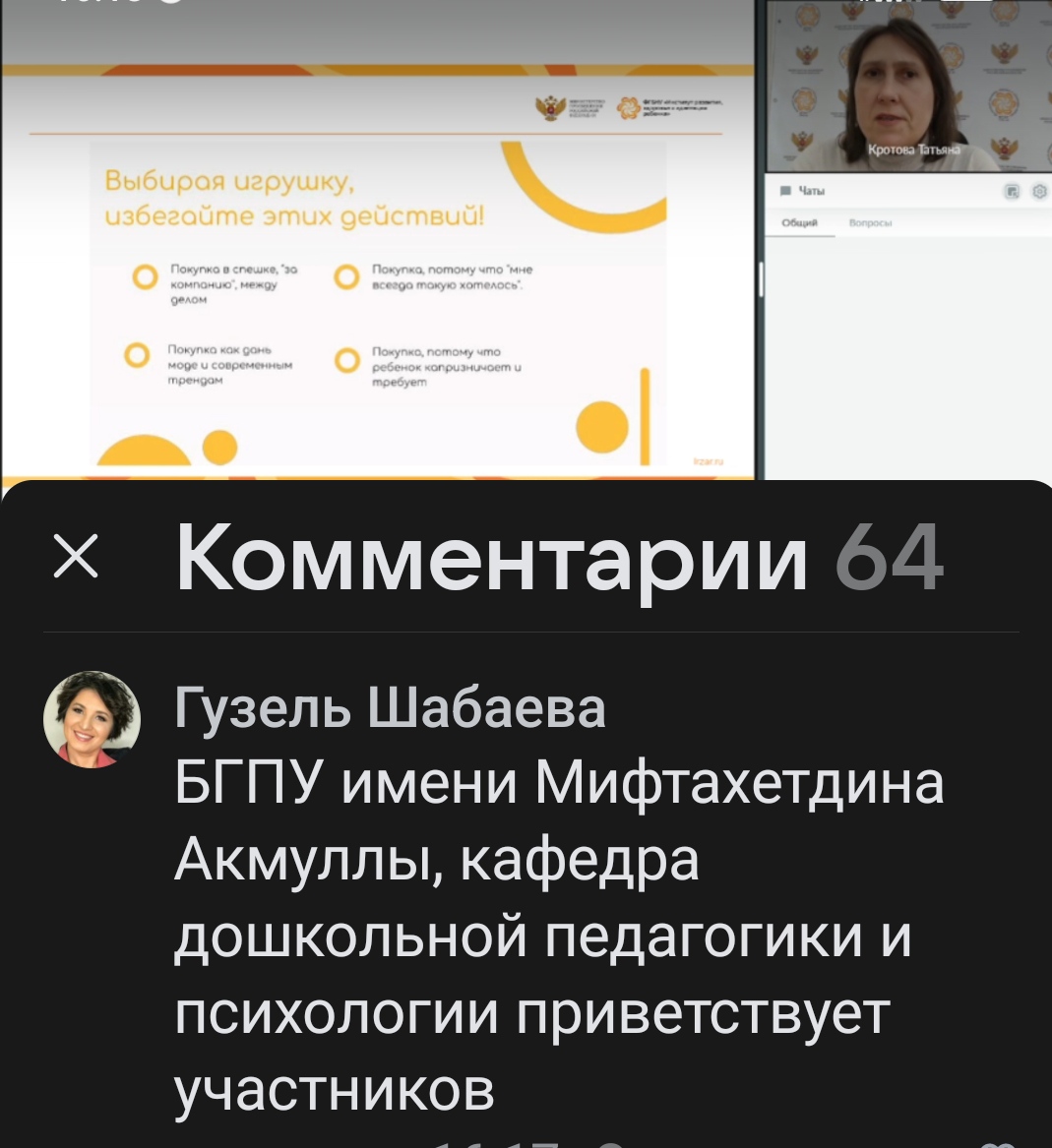 Спикером вебинара выступила Кротова Татьяна Викторовна, ведущий научный сотрудник лаборатории дошкольного образования ФГБНУ «Институт развития, здоровья и адаптации ребенка», кандидат педагогических наук.