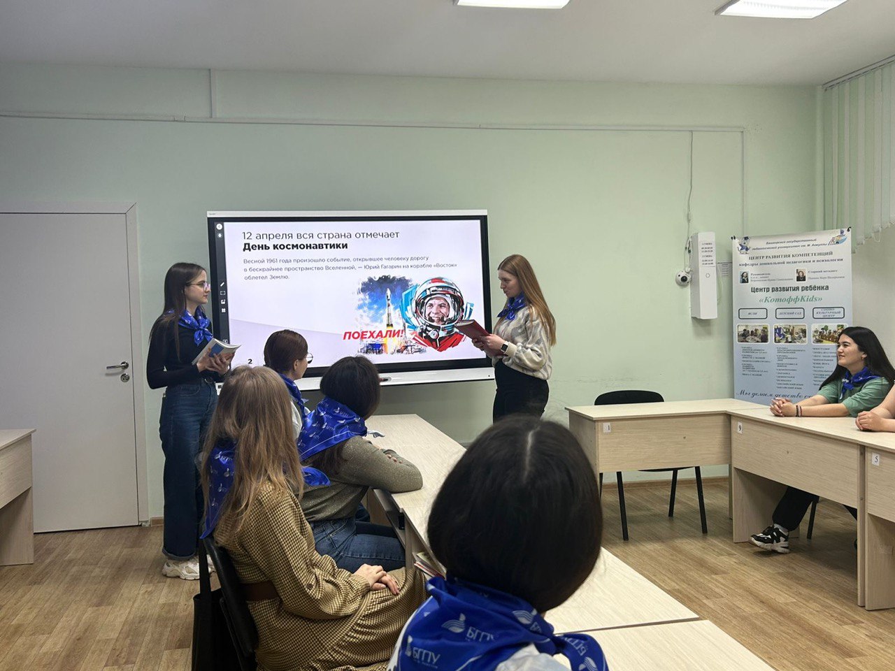 08 апреля 2024 года в рамках просветительских мероприятий Всероссийского проекта «Разговоры о важном!» для студентов, обучающихся по направлению «Педагогическое образование», профиль подготовки «Дошкольное образование», проведен тематический урок: «Я вижу Землю! Это так красиво!» Сегодня мы говорили о космонавтике, о выдающимся человеке Ю. Гагарине. Посмотрели познавательное видео о развитии космонавтики в нашей стране, обсудили научный героизм великих ученых: К.Циолковского, С.Королева. Интересным и необычным стал для нас блиц-опрос по истории развития этой отрасли. Особое внимание уделили вопросу о современном состоянии, открытиях России, заинтересовались вопросом о развитии различных наук на стыке с космической отраслью. «Так, появляются такие направления, как космический туризм, космобиология, астробиология, альтернативная биохимия и др. – всё это является неотъемлемой частью стремления человечества к постоянному совершенствованию и расширению знаний. Каждое новое открытие, каждый проведенный эксперимент в космосе, направлены на то, чтобы принести благо и пользу людям здесь, на Земле!»,- говорит в интервью летчик-космонавт (учёный-командир космического корабля) Сергей Рязанский. Особый интерес вызвал вопрос о возможности применения профессии студентов в космической области. Завершили урок словами-размышлениями на тему красоты Мира, Космоса, развития отрасли для следующих поколений.