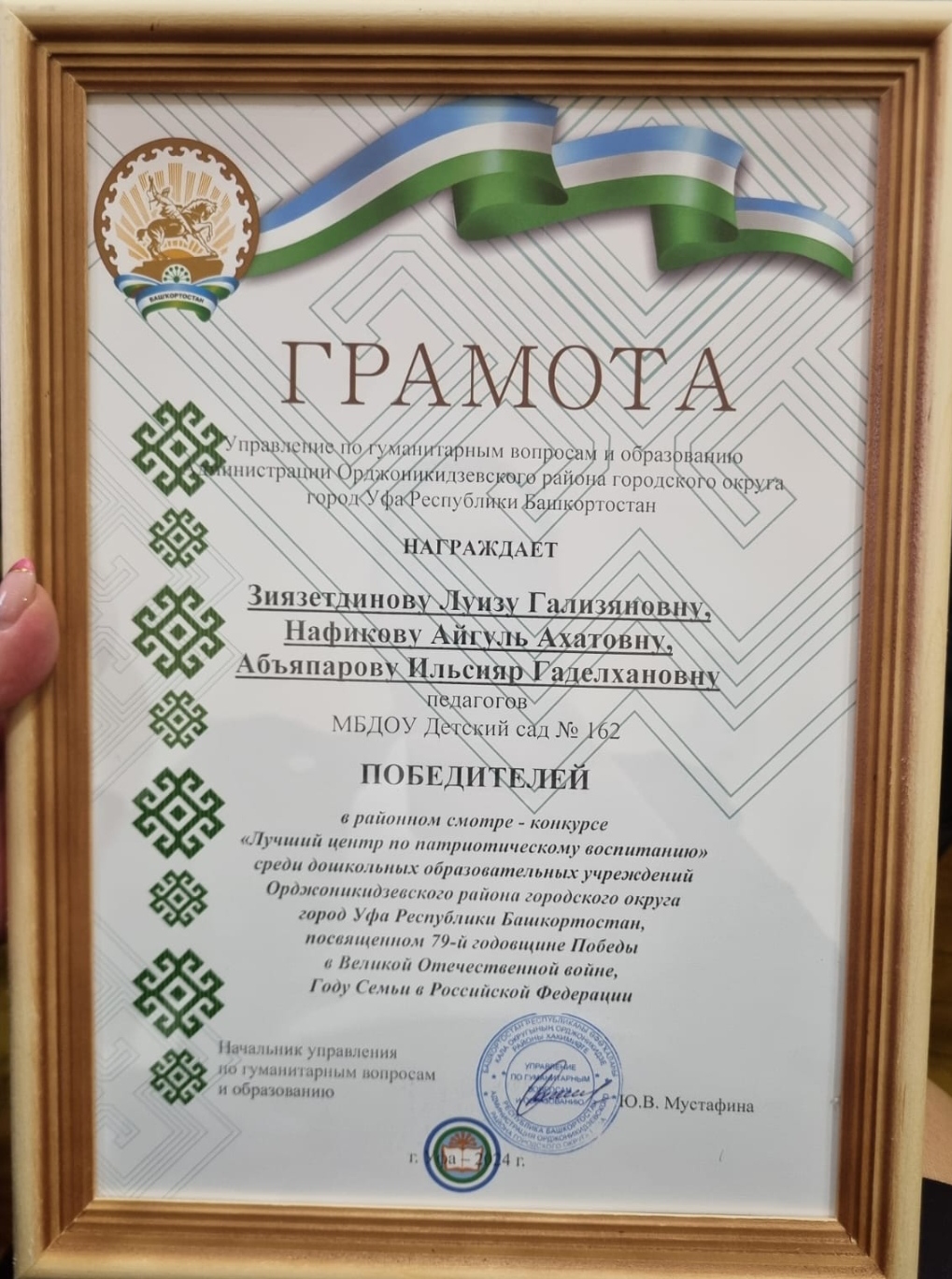 Победа в конкурсе на лучший центр по нравственно-патриотическому воспитанию показала высокий профессионализм педагогов ДОУ 162 г.Уфа по созданию условий для нравственно-патриотического воспитания в детском саду.