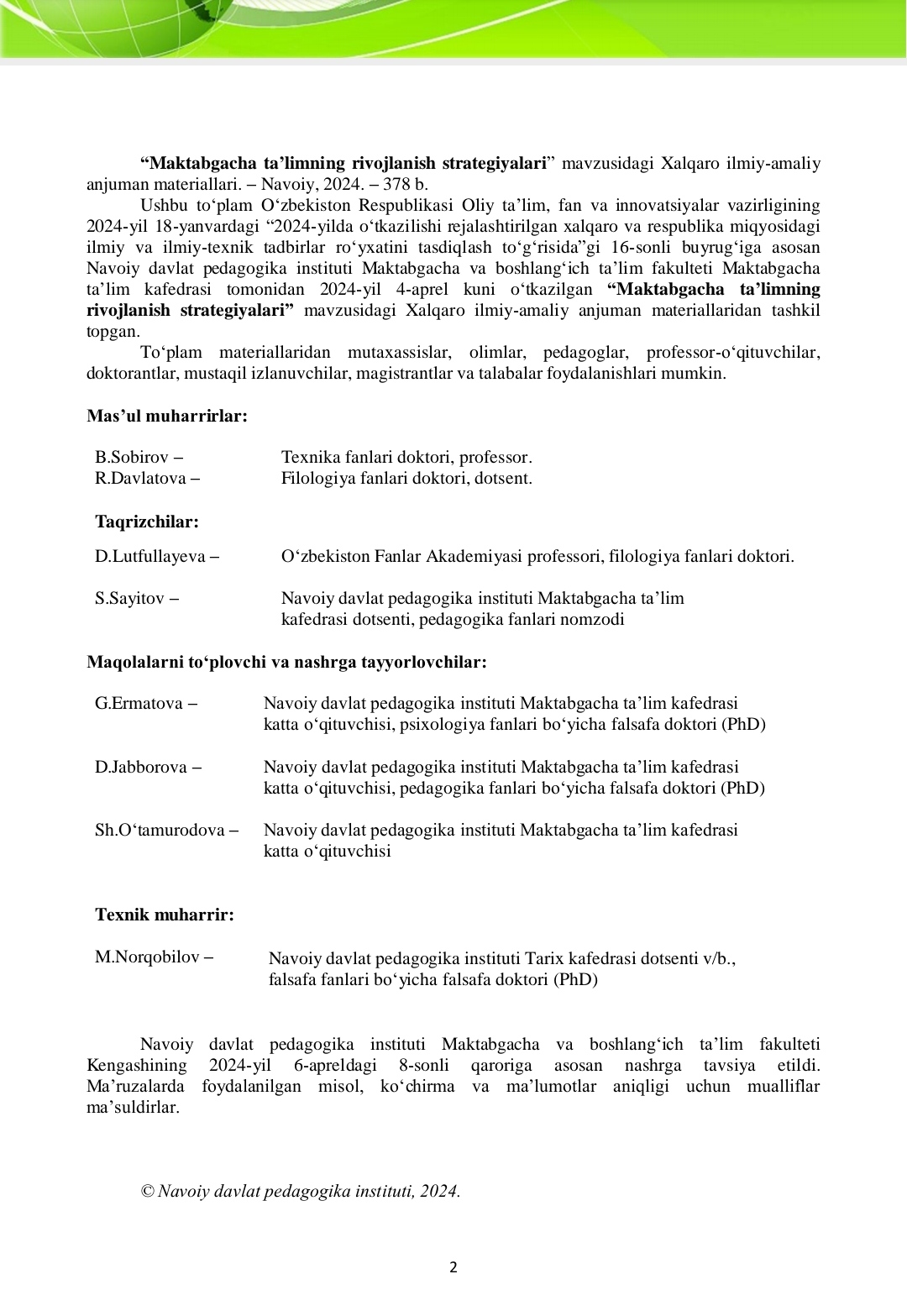 Navoiy davlat pedagogika instituti Maktabgacha va boshlang‗ich ta‘lim fakulteti Kengashining 2024-yil 6-apreldagi 8-sonli qaroriga asosan nashrga tavsiya etildi. Ma‘ruzalarda foydalanilgan misol, ko‗chirma va ma‘lumotlar aniqligi uchun mualliflar ma‘suldirlar