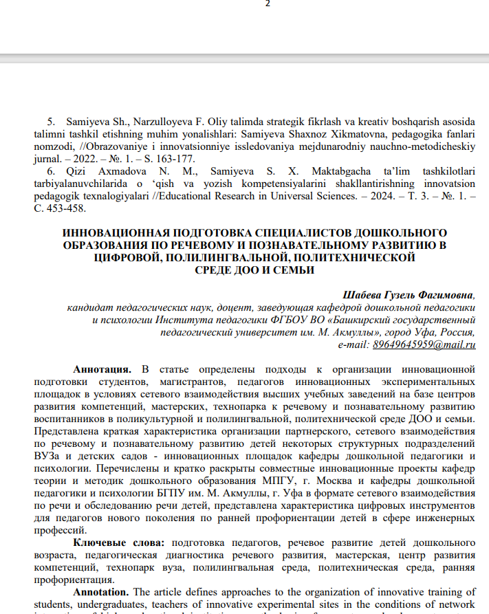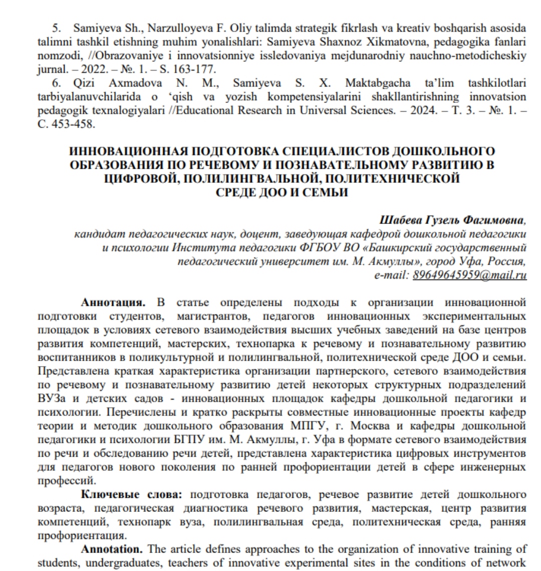 Шабева Гузель Фагимовна, к.п.н., доцент, заведующая кафедрой дошкольной педагогики и психологии «БГПУ им.М.Акмуллы» выступила с докладом и опубликовала статью на тему: «Инновационная подготовка специалистов дошкольного образования по речевому и познавательному развитию в цифровой, полилингвальной, политехнической среде ДОО и семьи».