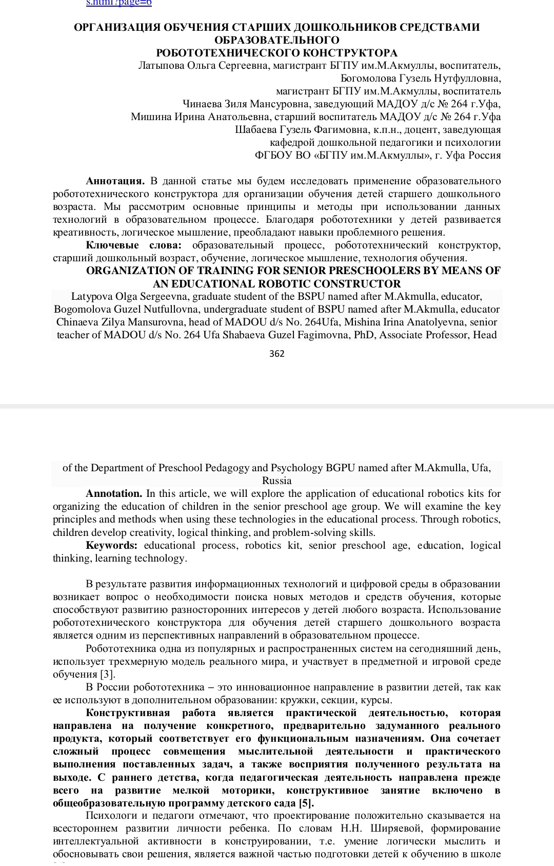 Магистранты кафедры ДПиП и педагоги инновационной площадки кафедры ДПиП Акмуллинского университета выступили с докладом и опубликовали статью на тему: «Организация обучения старших дошкольников средствами образовательного робототехнического конструктора»,
