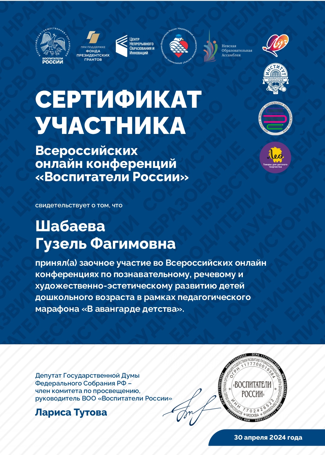 "Воспитатели России". Получила сертификат.