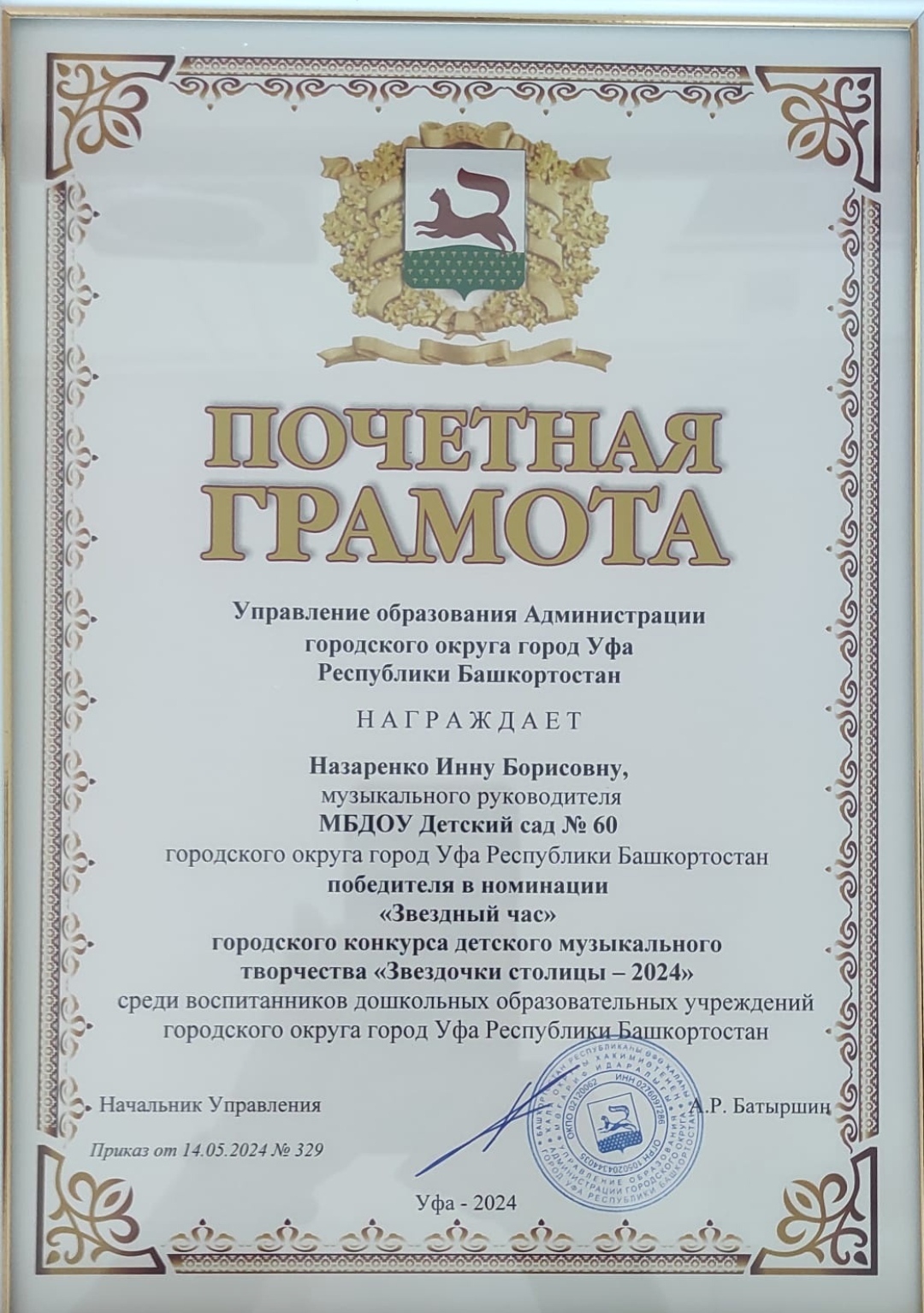 Пройдя районный этап конкурса, наши воспитанники,под руководством музыкального руководителя Назаренко Инны Борисовны, вышли в финал конкурса с танцевальным номером «Три кита» и заняли призовое место  в номинации "Звездный час"!  Инновационная площадка Акмуллинского университета МБДОУ д/ с 60 г.Уфа