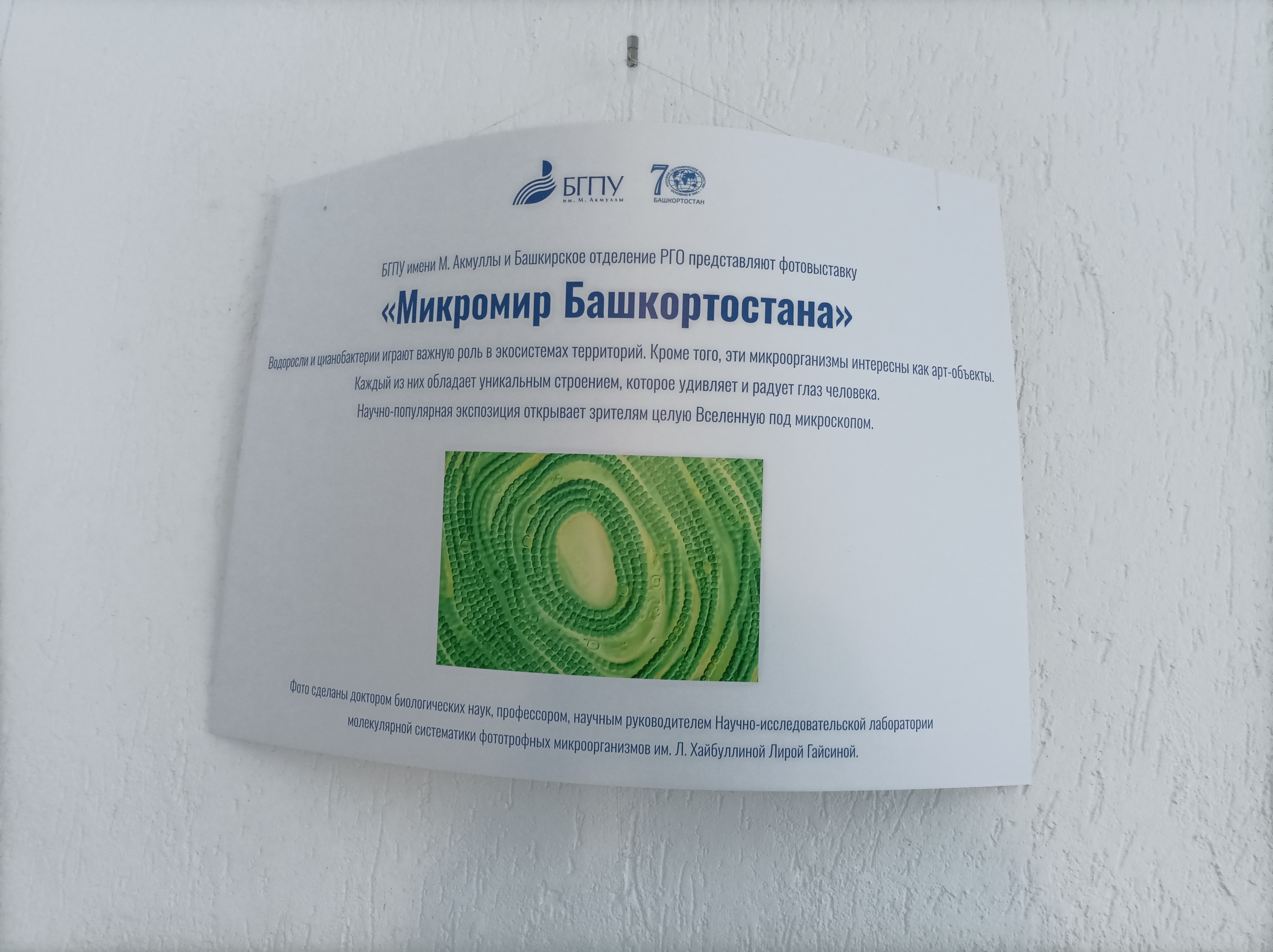 "В День эколога, 5 июня, БГПУ имени Акмуллы и Башкирский филиал РГО представили фотоэкспозицию, посвященную водорослям и цианобактериям Республики Башкортостан. Фотографии водорослей и цианобактерий можно отнести к произведениям искусства, которые радуют глаз человека.
