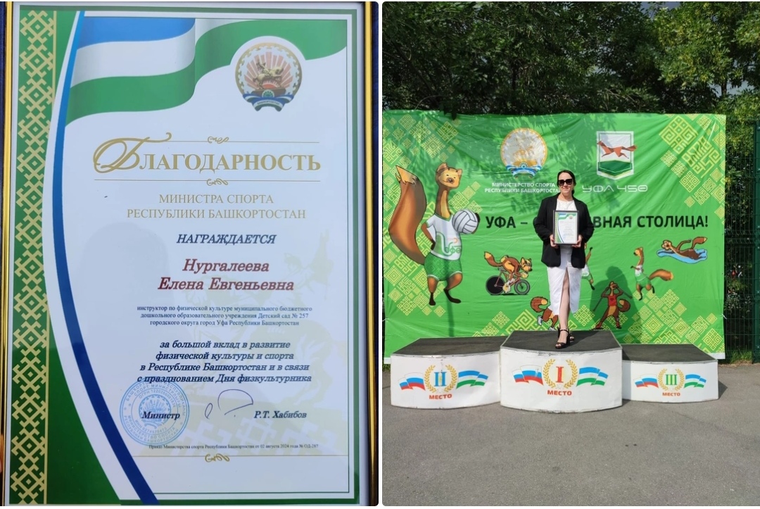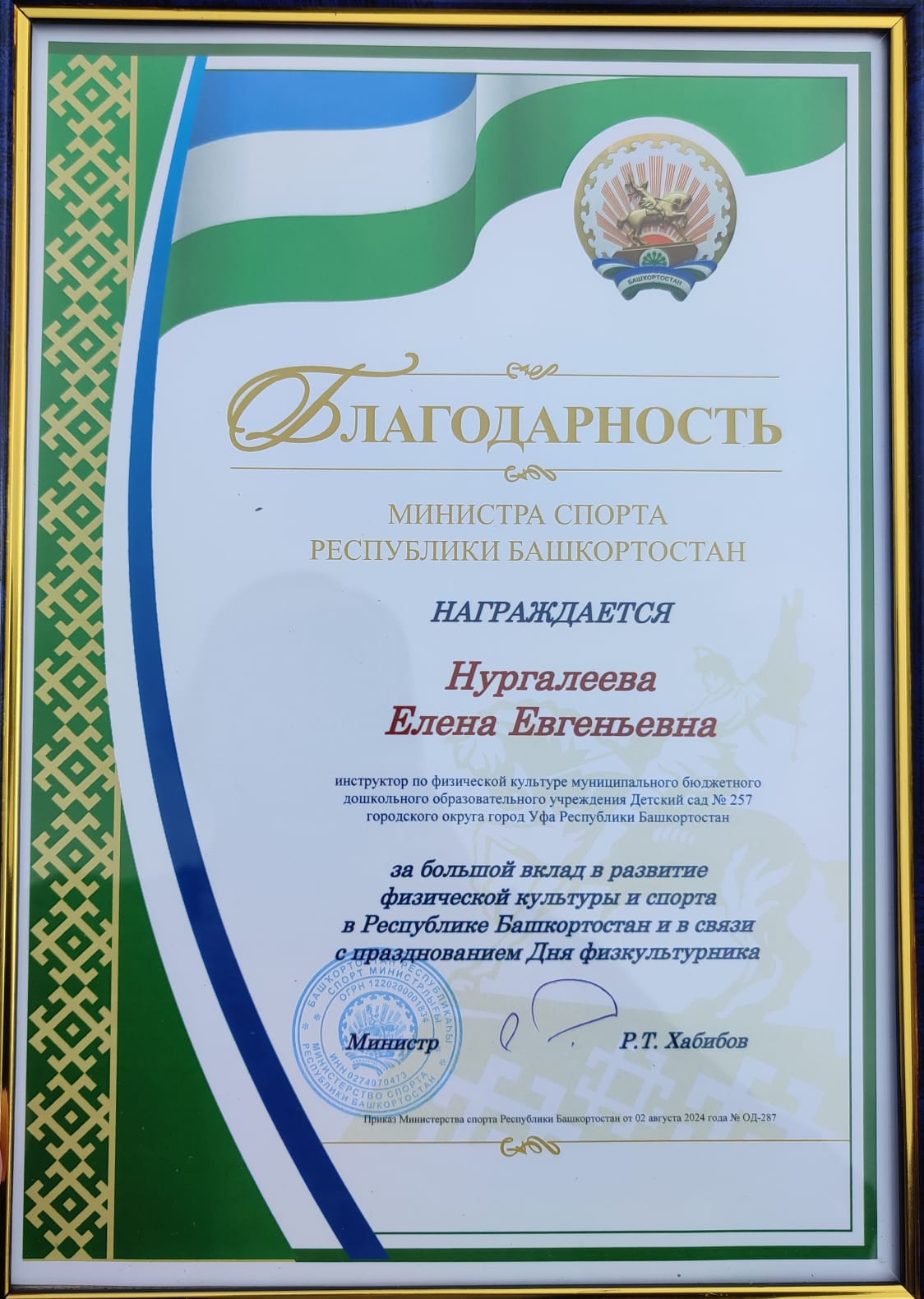 Студентка кафедры ДПиП Института педагогики БГПУ имени Мифтахетдина Акмуллы 2 курса  ЗПДОС Нургалеева Елена Евгеньевна получила  ведомственную награду "Благодарность Министра Спорта РБ за большой вклад в развитие физической культуры и спорта в РБ".