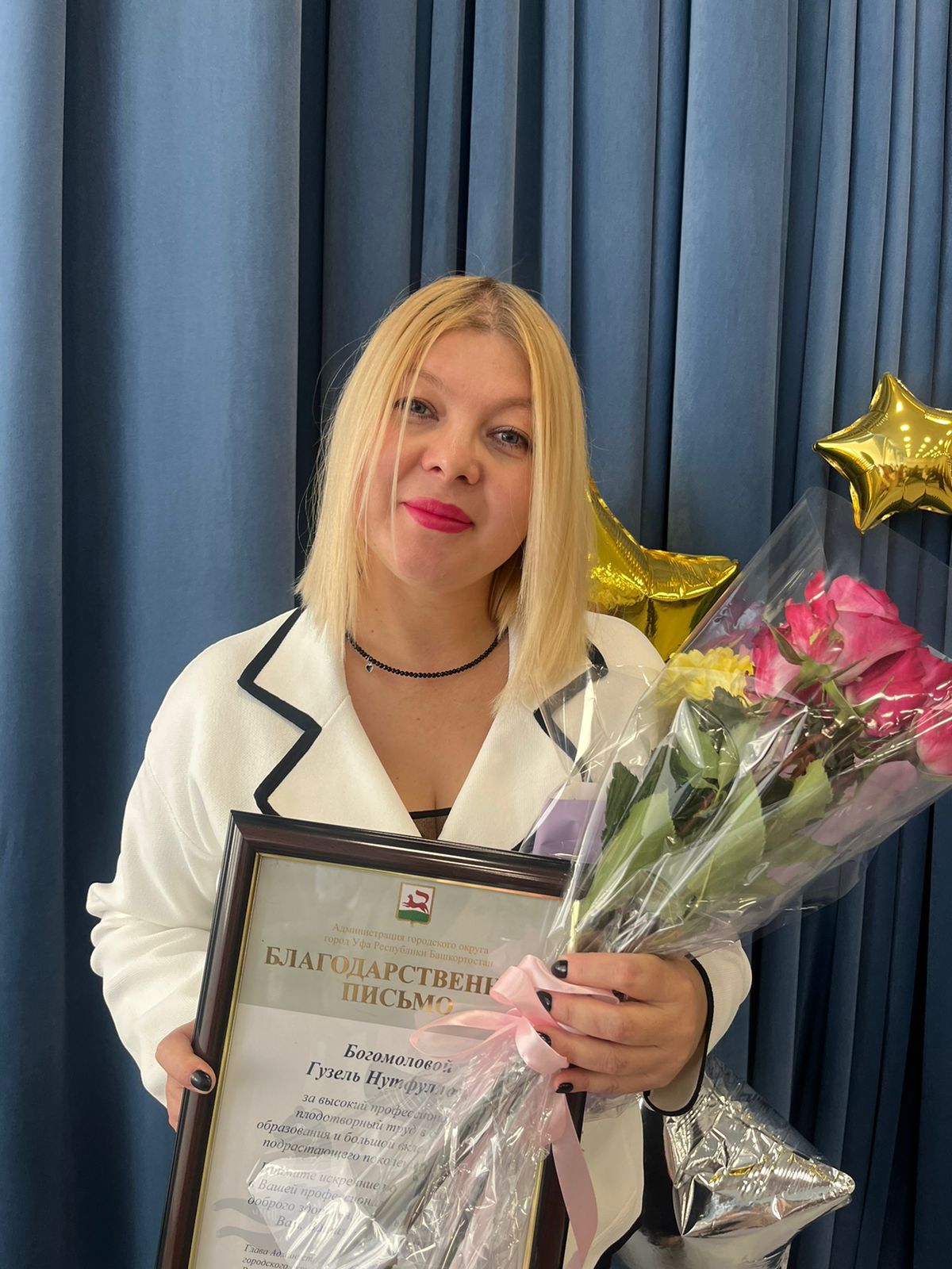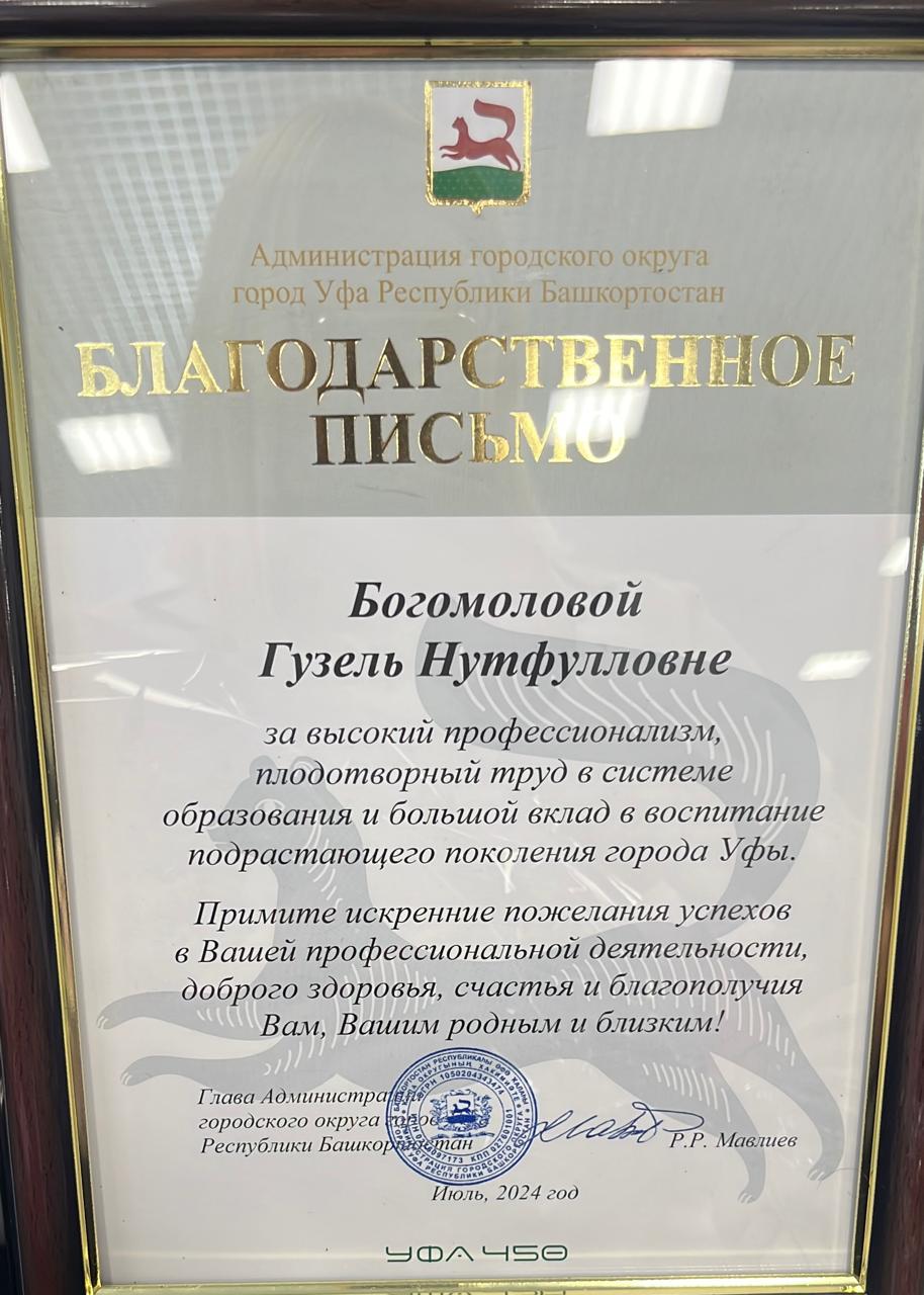 02.10.2024г. Торжественное вручение благодарственного письма магистранту кафедры ДПиП от Главы Администрации ГО г.Уфа Мавлиева Р.Р. На базе Муниципального автономного общеобразовательного учреждения "Центр образования № 51 имени Паращенко Владимира Михайловича" городского округа г.Уфа республики Башкортостан прошел торжественный концерт и поздравления отличившимся педагогам Благодарственное письмо от Главы Администрации ГО г.Уфа Мавлиева Р.Р.  Администрации городского округа  г. Уфа Республика Башкортостан за высокий профессионализм , плодотворный труд в системе образования и большой вклад в воспитание подрастающего поколения города Уфы Богомоловой Гузель Нутфулловне,  воспитателю МАДОУ  детский  сад 264 г.Уфа, Магистранту  2 курса кафедры ДПиП Института педагогики БГПУ им.М.Акмуллы