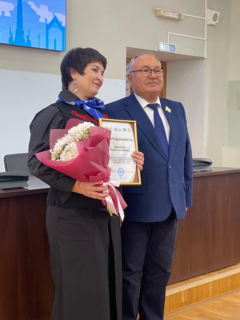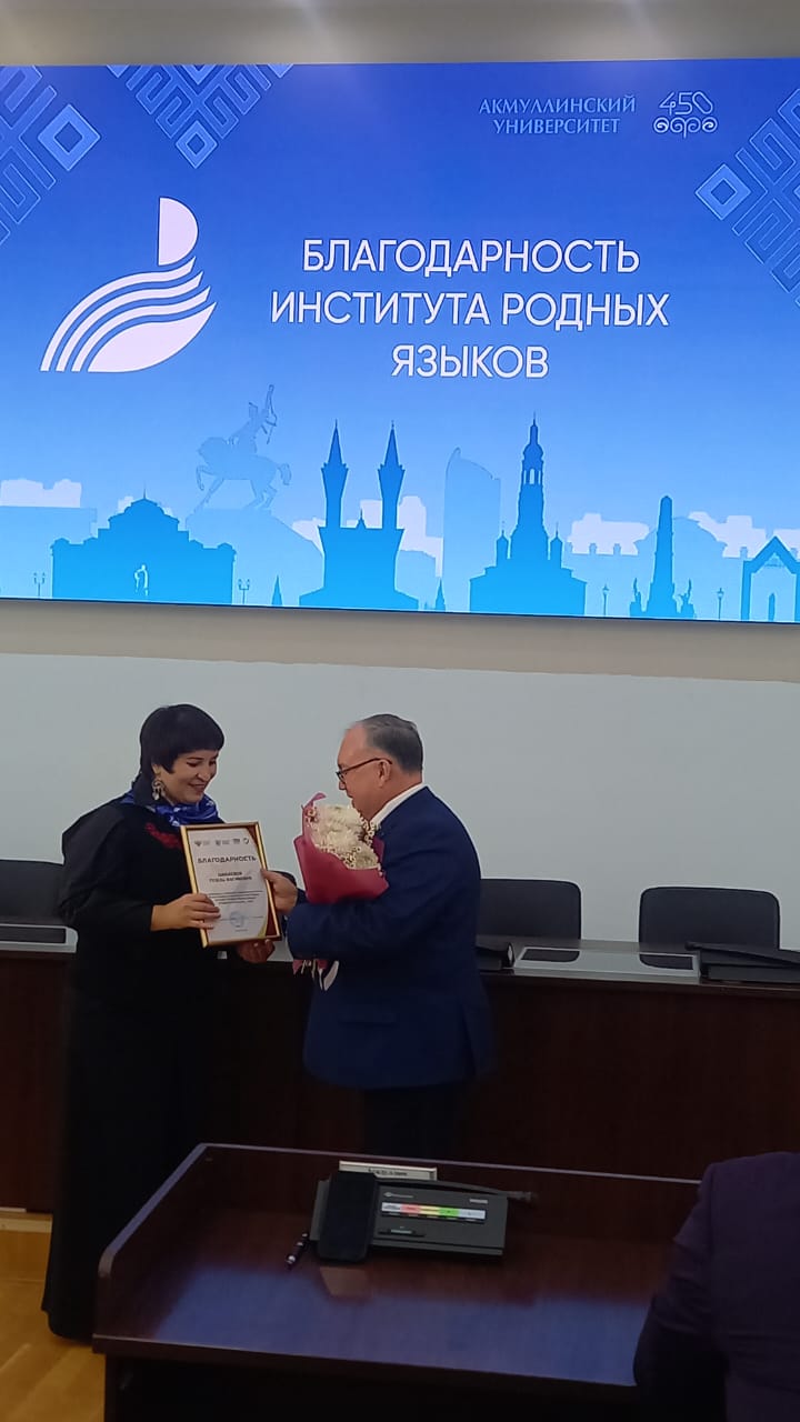 вручено благодарственное письмо Министерства просвещения Российской Федерации Федерального института родных языков за активное участие в организации и проведении Всероссийского профессионального конкурса «Лучший учитель родного языка и литературы», который прошел в Казани в сентябре 2024 года.