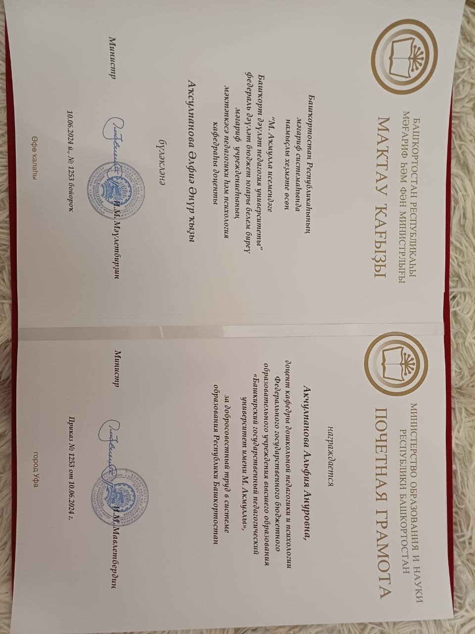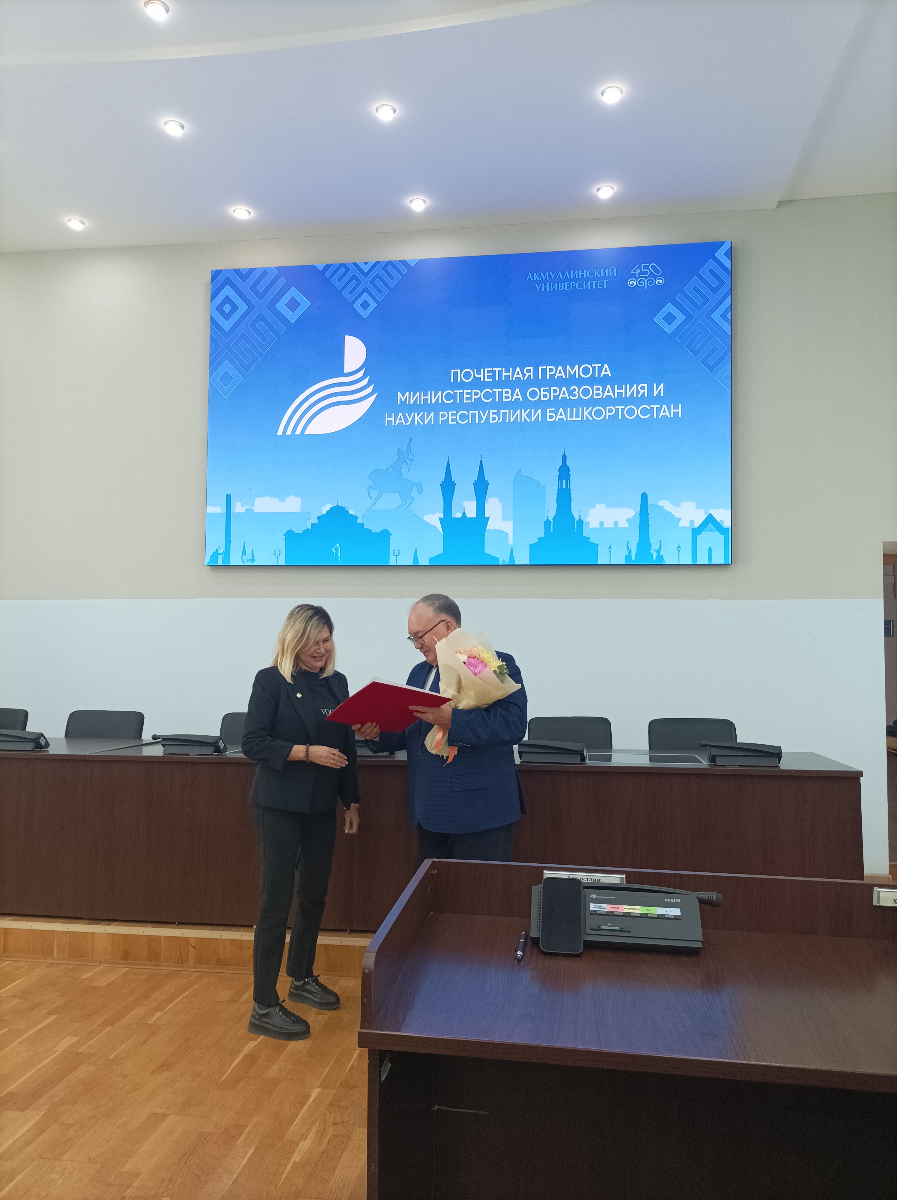 09.10.2024г. Акчулпанова Альфия Ануровна к.п.н.,доцент кафедры дошкольной педагогики и психологии была награждена Почетной грамотой Министерства образования и науки Республики Башкортостан за Добросовестный труд в системе образования Республики Башкортостан