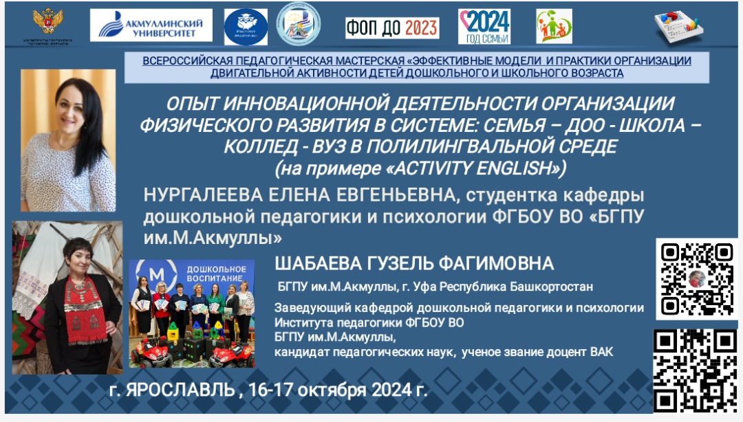Представили Республику Башкортостан г. Уфа БГПУ им М.Акмуллы с научно-методический, практико-ориентированным опытом университета на базе центров развития компетенций "Педагог дошкольного образования" и ЦРК  "Акмуллинская академия  развития детей детей и семейного образования СОТЫ"  "Опыт инновационной деятельности организации физического развития  в системе: Семья - ДОО - Школа - Колледж - Вуз - производство в полилингвальной среде",  с инновационным  опытом работы по проекту