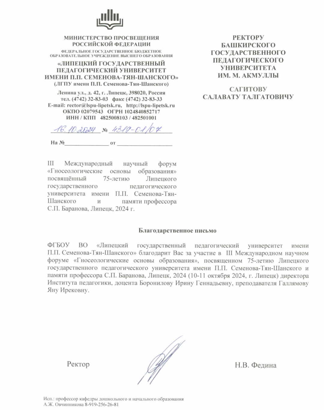 Благодарность за участие в III Международном научном форуме «Гносеологические основы образования», посвященном 75-летию Липецкого государственного педагогического университета имени П.П. Семенова-Тян-Шанского и памяти профессора С.П. Баранова, 10-11 октября 2024 г. директору Института педагогики, к.п.н., доц. Борониловой И.Г., аспиранту Галлямовой Я.И.