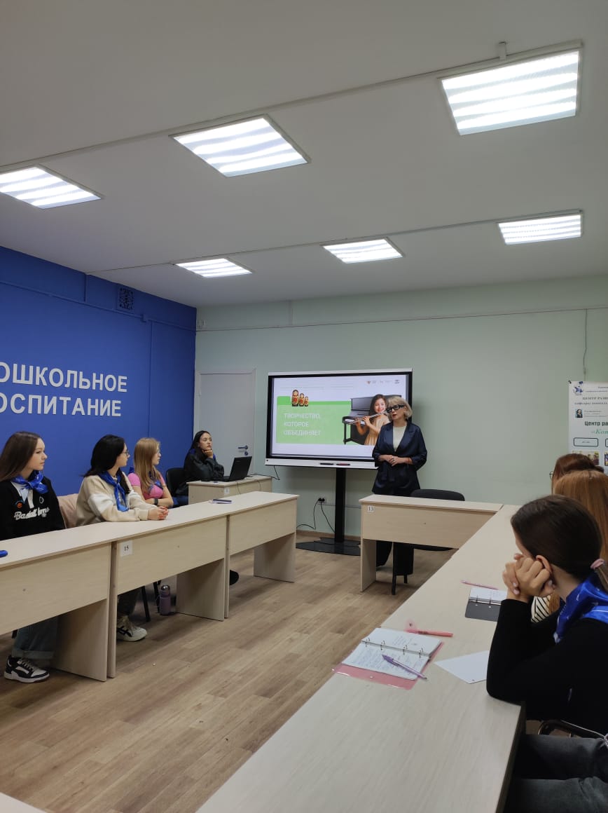 15 сентября  2025  к.п.н., доцент кафедры Дошкольной педагогики и психологии Сыртланова Н.Ш.  провела Разговоры о важном по теме «Творчество, которое объединяет» со студентами 4 курса по профилю Дошкольное образование. Данная тема, где дискутировались вопросы  возможностей для реализации творческого потенциала каждого студента, раскрывались особенности современных жанров и история конкурса «Интервидение»,  обсуждались произведения русских классиков как признанное мировое достояние России - явились заделом для продолжения лекции по «Методике и технологии музыкального развития дошкольников».