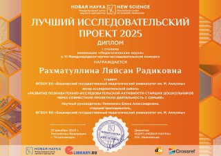 В IV Международном научно-исследовательском конкурсе «Лучший исследовательский проект 2025» дипломом I степени награжден студент 4 курса направления подготовки «Педагогическое образование», профиль «Дошкольное образование» Рахматуллина Ляйсан Радиковна, под руководством Пилипенко Елены Александровны.