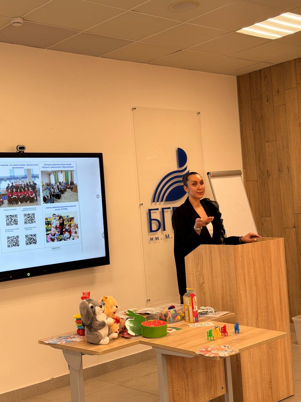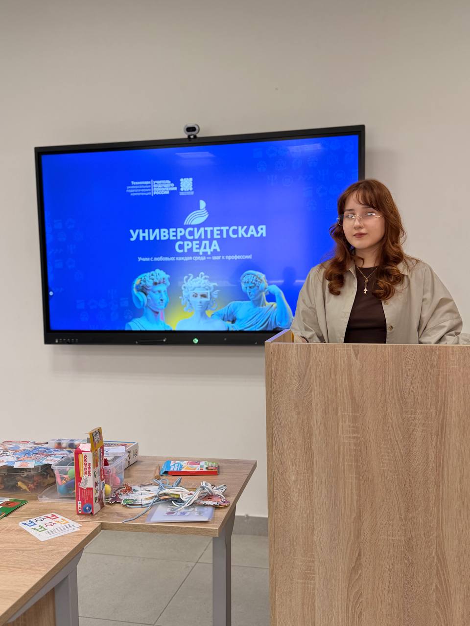 Особый интерес у гостей вызвал второй блок — интерактивный мастер-класс «От ладошки к речи: как сенсомоторные игры способствуют развитию детей раннего возраста». Это был не просто рассказ о профессии, а живая демонстрация её творческой и научной составляющей. Валентина Николаевна Кинцель объяснила, что сенсомоторное развитие — это база, на которой строится всё дальнейшее познание мира ребёнком. Студентки Виктория и Владислава наглядно показали, какие простые, но эффективные упражнения можно использовать как в детском саду, так и дома.