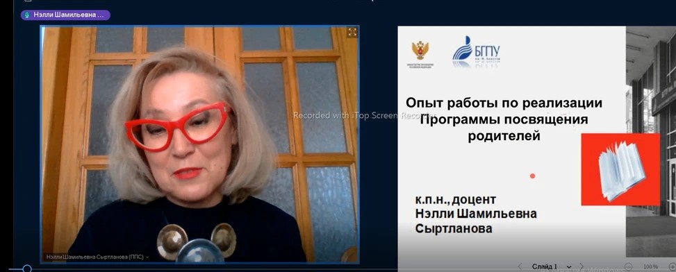 С докладом, по опыту реализации Программы просвещения родителей дошкольников, в формате онлайн, выступила к.п.н., доцент кафедры дошкольной педагогики и психологии Сыртланова Н.Ш.  В рамках работы Дискуссионной площадки «Современные ориентиры профессионального роста воспитателя детского сада»  Сыртлановой Н.Ш. была проведена профориентационная работа.