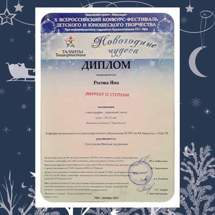Дипломом ЛАУРЕАТА II степени Х Всероссийского конкурса-фестиваля детского и юношеского творчества «Таланты Башкортостана -Новогодние чудеса».