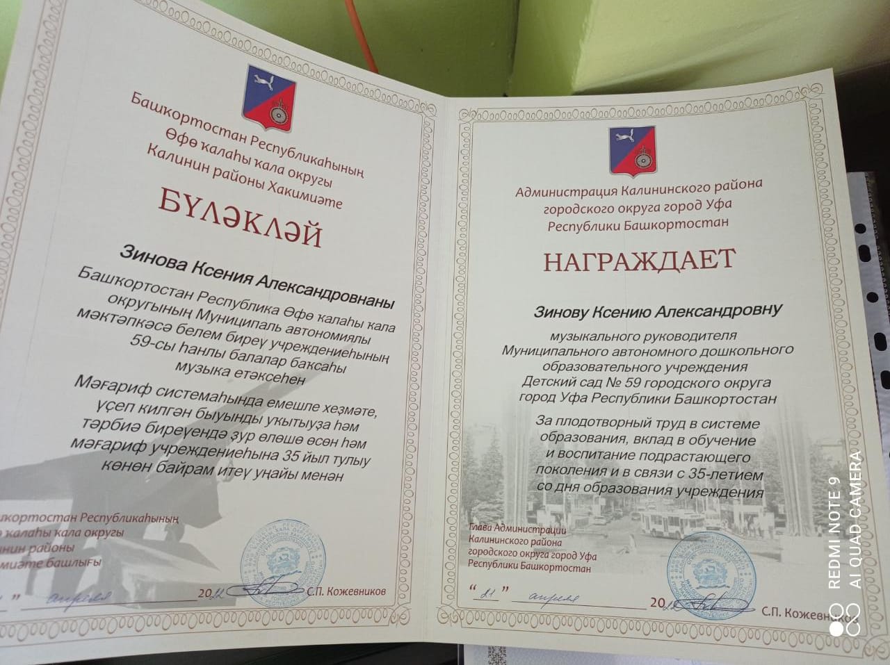 В Ансамбле Национального Танца "ЭНЖЕ" работает профессиональный человек, педагог-хореограф Зинова Ксения Александровна! Администрация Калининского района городского округа город Уфа Республики Башкортостан наградила Зинову Ксению Александровну Почетной грамотой за плодотворный труд в системе образования, вклад в обучение и воспитание подрастающего поколения. Общероссийский Профсоюз образования так же наградил Почетной грамотой за активную работу в Профсоюзе.