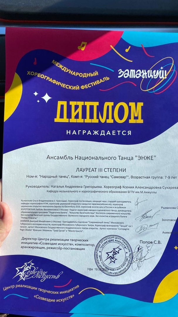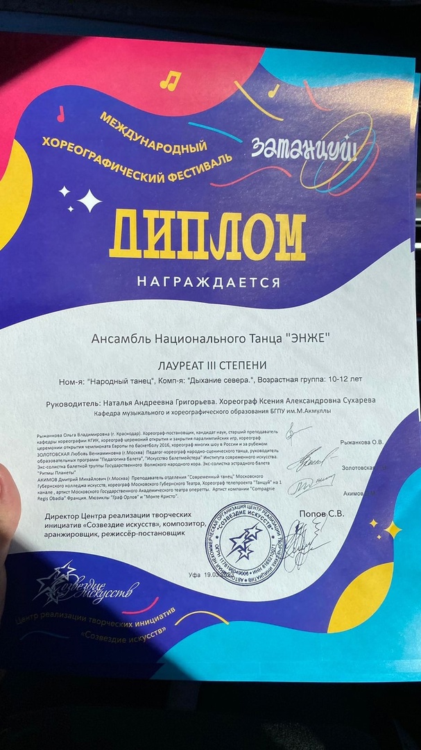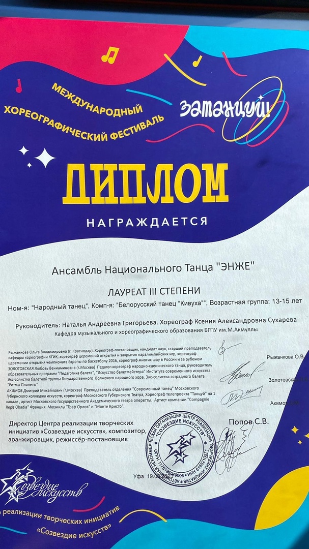 19 марта в г. Уфа состоялся Международный хореографический конкурс «Затанцуй». Ансамбль Национального Танца "ЭНЖЕ" стал участником этого события и завоевал призовые места. Жюри было строгим и справедливым, мнения их очень важно для нас, начинаешь задумываться и стремишься к лучшему. Продолжаем работать и творить, а впереди нас ждёт конкурс в Казани, ещё одно испытание для ЭНЖЕ!)