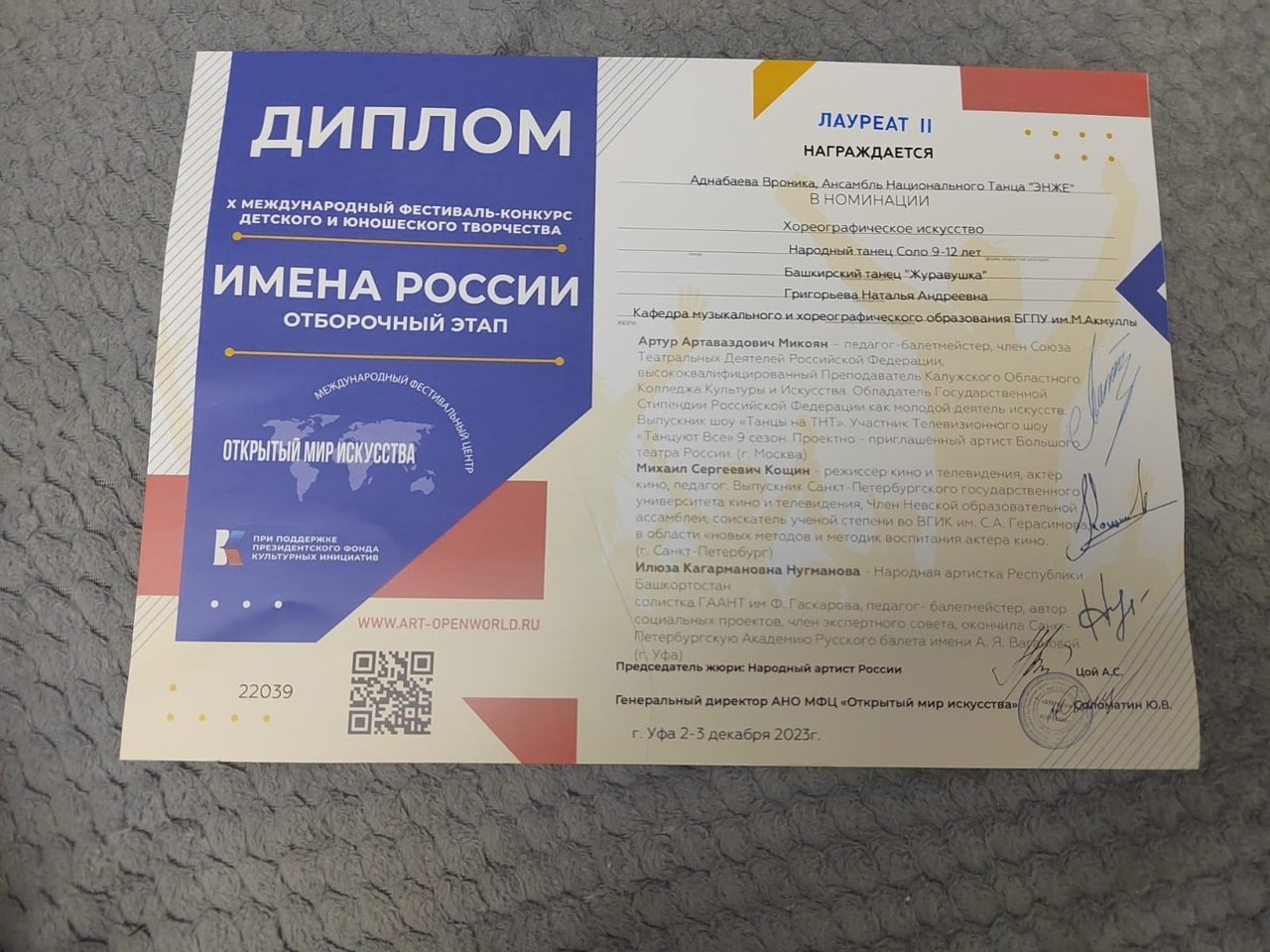 3 декабря старшая группа Вихрь Ансамбля ЭНЖЕ стала участником Международного фестиваля детского и юношеского творчества «Имена России». на сцене ДК ""Атайсал"и становится Лауреатом 1 степени (белорусский танец "Кивуха") и Лауреатом 2 степени Вероника Аднабаева, соло (башкирский танец "Журавушка").