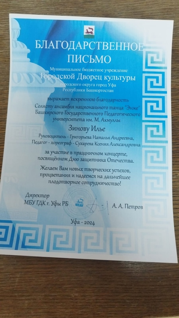 20 февраля солист Ансамбля Национального Танца ЭНЖЕ БГПУ им. М. Акмуллы Илья Зинов принял участие в правительственном концерте и на торжественном собрании в честь Дня защитника Отечества в Городском дворце культуры. В концерте участвовали лучшие артисты Республики Башкортостан: Уфимский ансамбль песни и танца Мирас, Заслуженный коллектив народного танца Республики Башкортостан народный ансамбль танца "Байрам" и самый маленький артист Ансамбля ЭНЖЕ (7 лет).