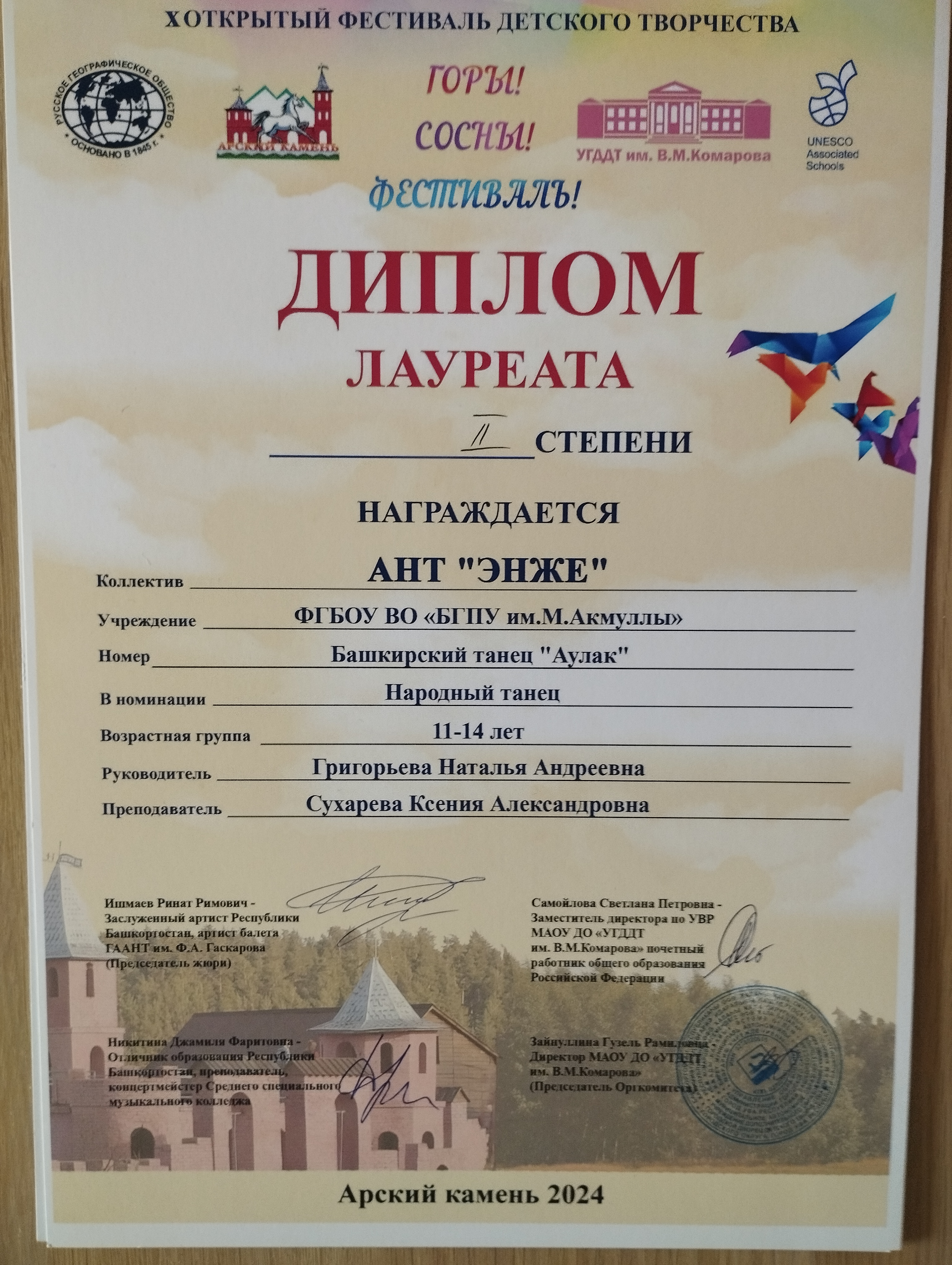 3.Башкирский танец «Аулак» (11-14 лет, ансамбль) - Лауреат 2 степени.
