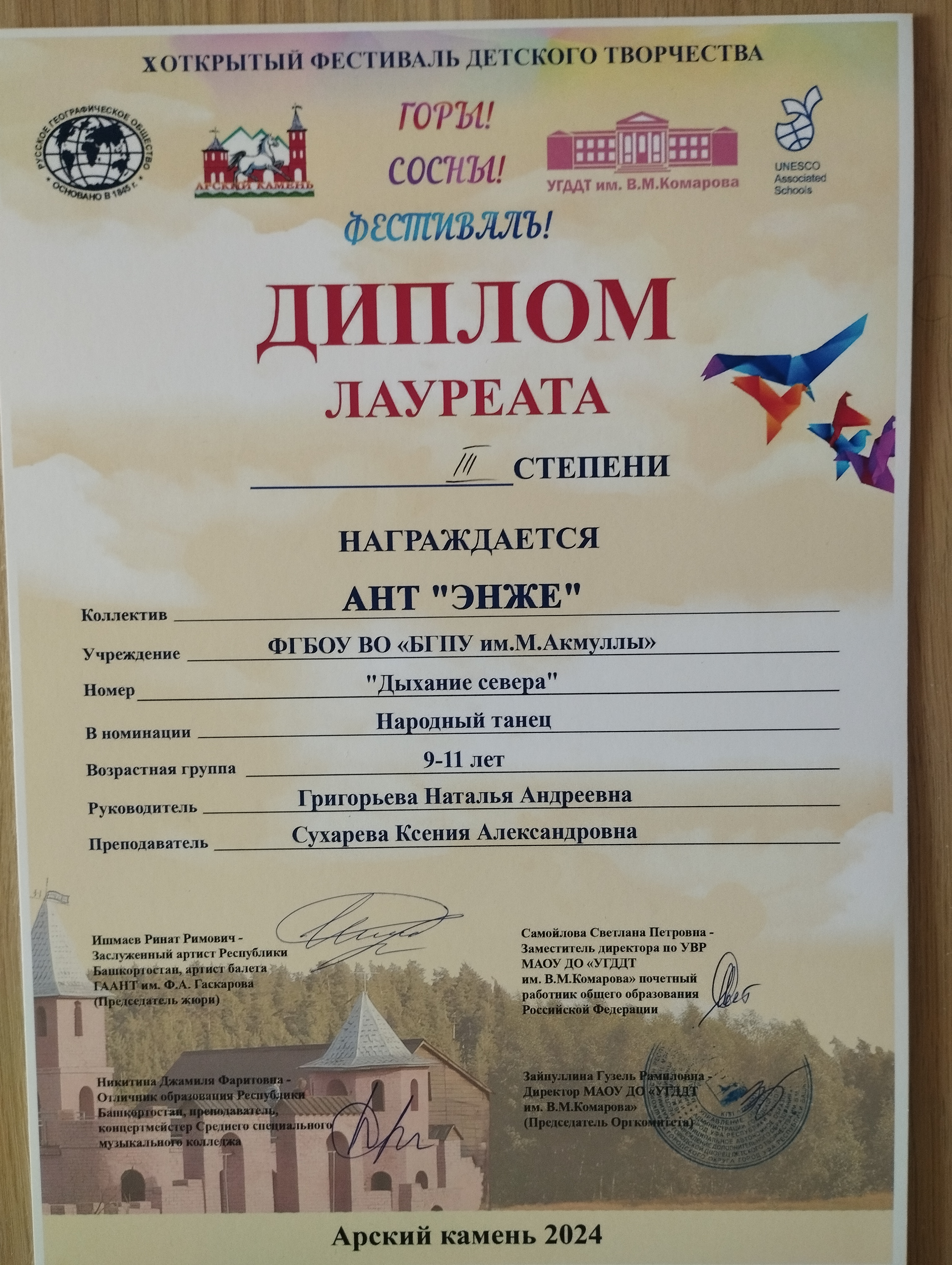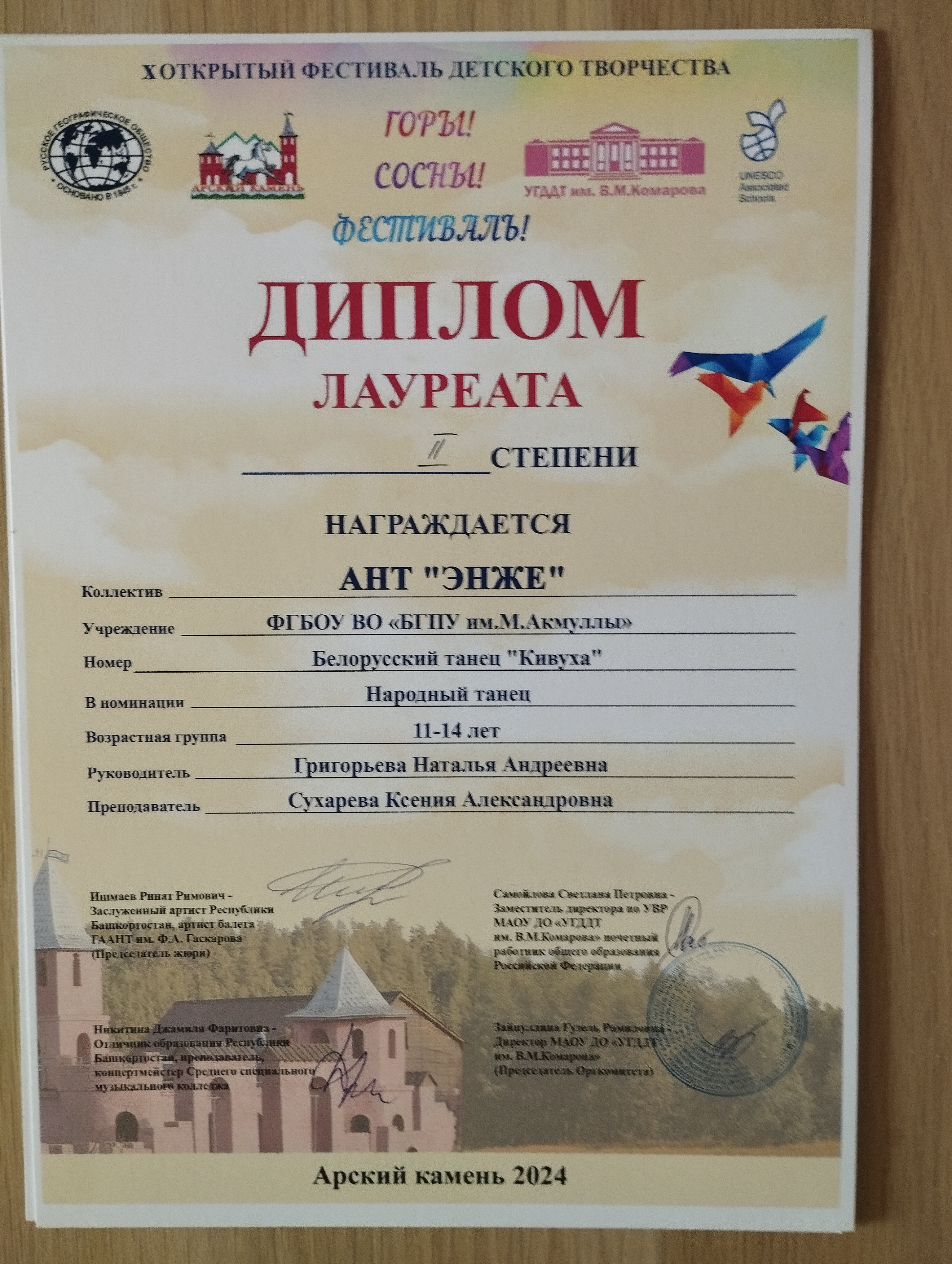 С 28 апреля по 1 мая Ансамбль Национального Танца "ЭНЖЕ" принял участие в фестивале-конкурсе "Горы! Сосны! Фестиваль!", который прошел на базе отдыха «Арский камень» (Белорецкий район РБ), расположенной в самом центре горной части Южного Урала, неподалеку от истоков красавицы Белой – главной реки Башкортостана. База отдыха с трех сторон окружена изгибом Белой, а с четвертой вплотную подступает густой сосновый бор. В программу фестиваля вошли конкурсные выступления, досуговая программа, экскурсии, пешие прогулки по живописным окрестностям, к памятникам природы и историческим местам. Организаторы Фестиваля – МАОУ ДО «Уфимский городской Дворец детского творчества им. В.М. Комарова», Комитет Республики Башкортостан по делам ЮНЕСКО, Региональное отделение Русского географического общества в Республике Башкортостан. Основная идея Фестиваля – уникальная природа родного края как источник творческого развития, патриотического воспитания и оздоровления детей.