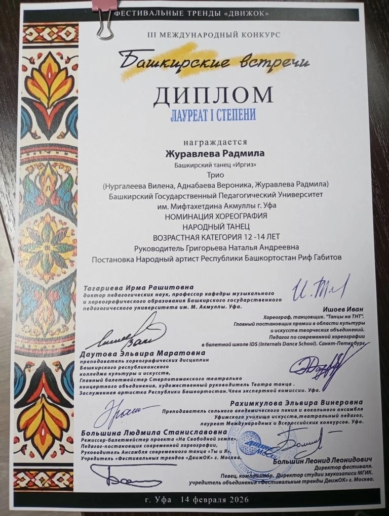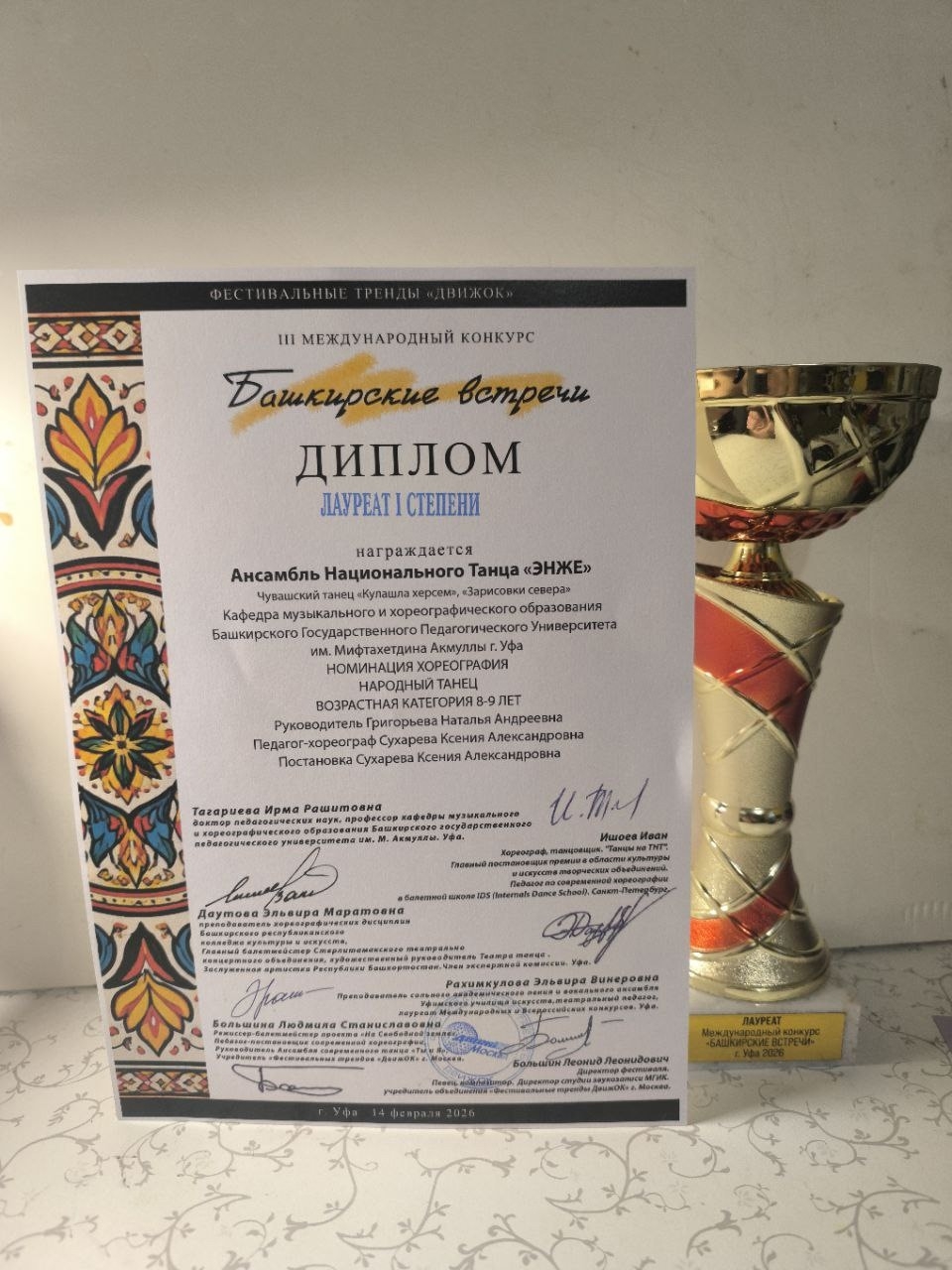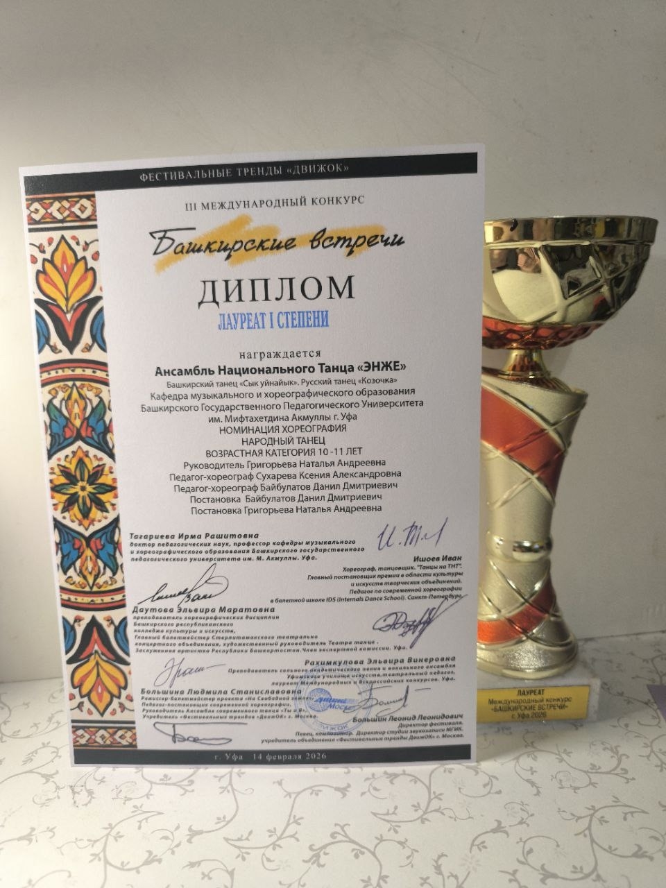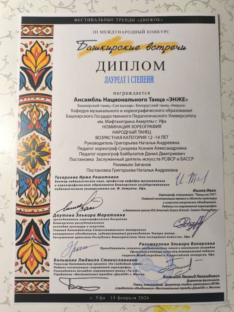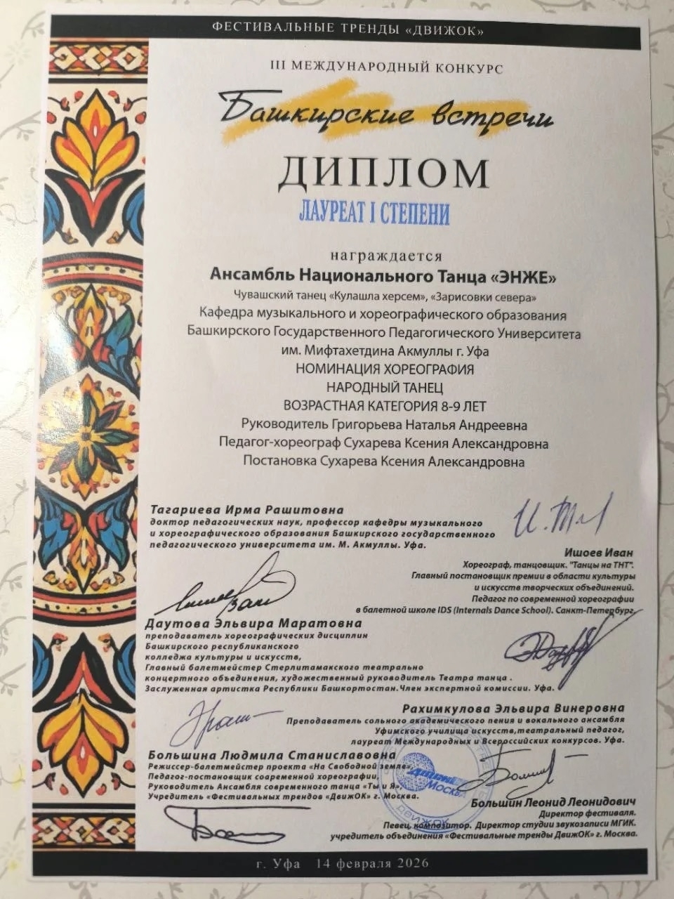 III Международный конкурс детского и юношеского творчества «Башкирские встречи» состоялся 14 февраля в Городском культурно-досуговом центре г. Уфа. Ансамбль Национального Танца «ЭНЖЕ» стал ярким участником этого значимого события, представив на суд жюри 6 массовых и 8 сольных хореографических номеров, которые продемонстрировали высокий уровень мастерства и богатство национальной культуры. Коллектив показал работу трех возрастных групп и балетмейстерские постановки педагогов, что подчеркнуло преемственность традиций и новаторский подход в хореографии.